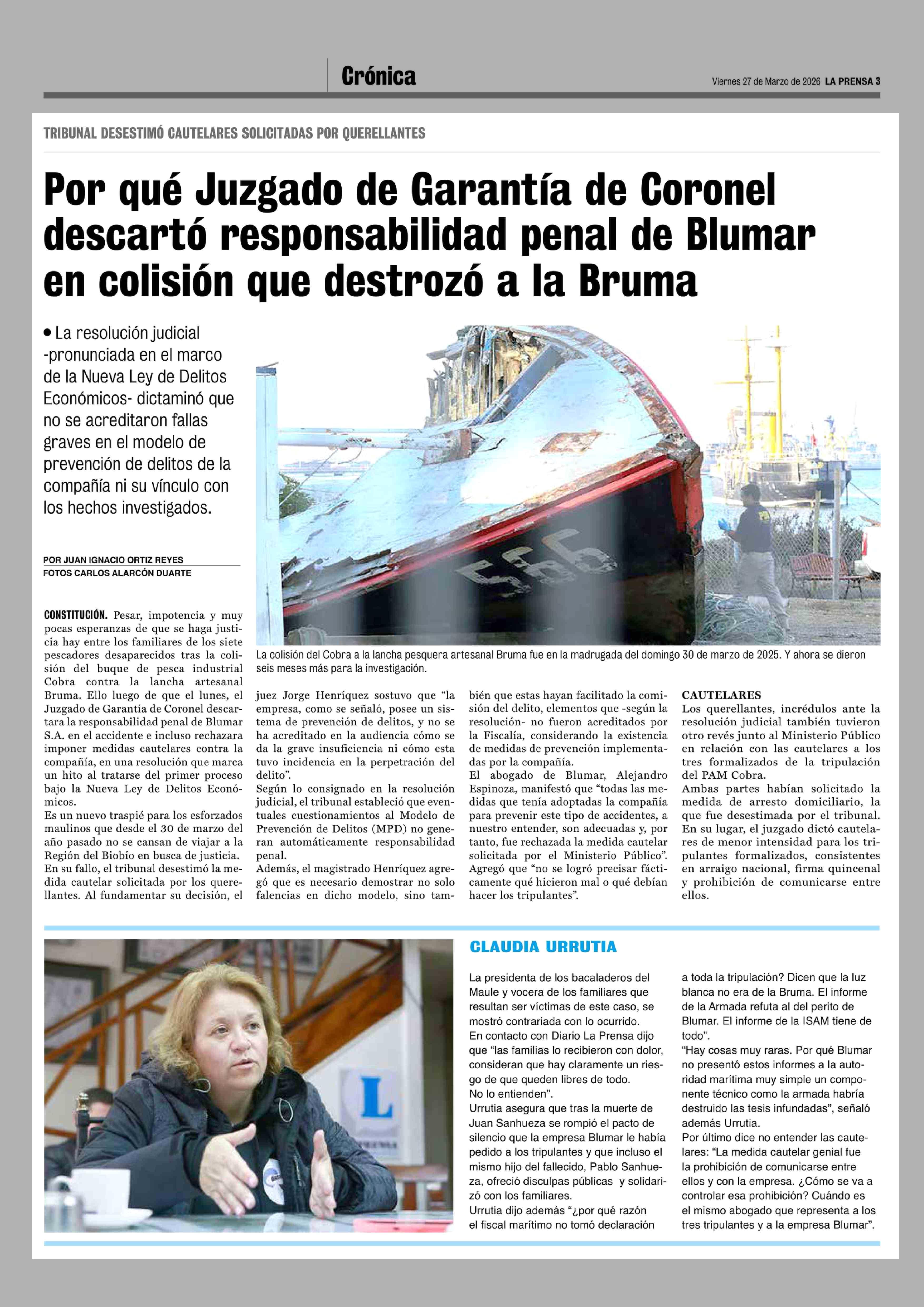 Por qué Juzgado de Garantía de Coronel descartó responsabilidad penal de Blumar en colisión que destrozó a la Bruma 27-03-2026 La Prensa de Curicó |