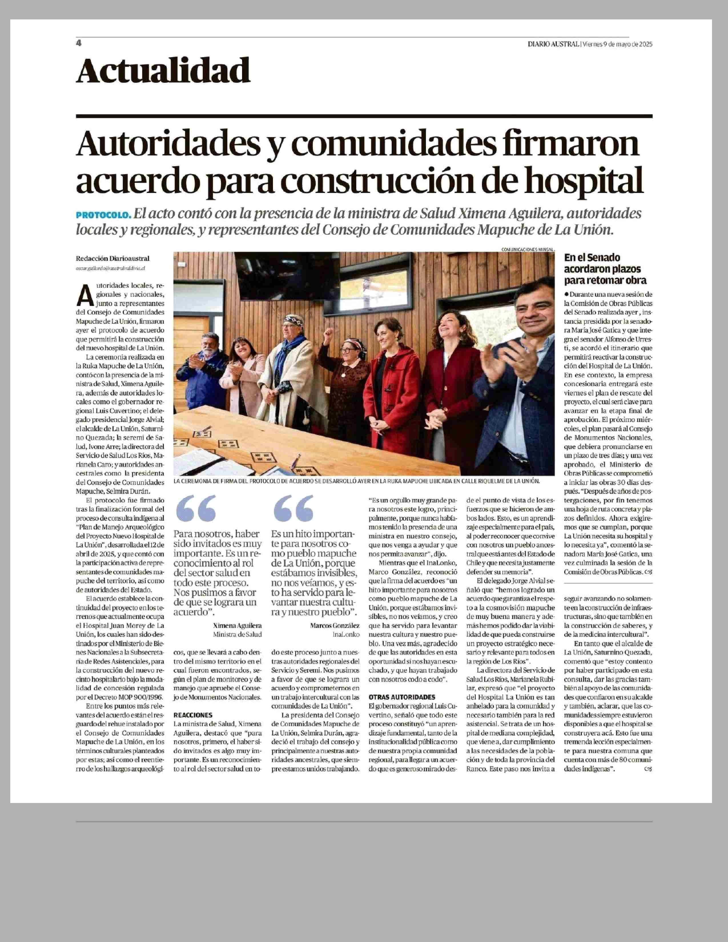 Autoridades y comunidades firmaron acuerdo para construcción de hospital 09-05-2025 Diario Austral Región de Los Ríos |