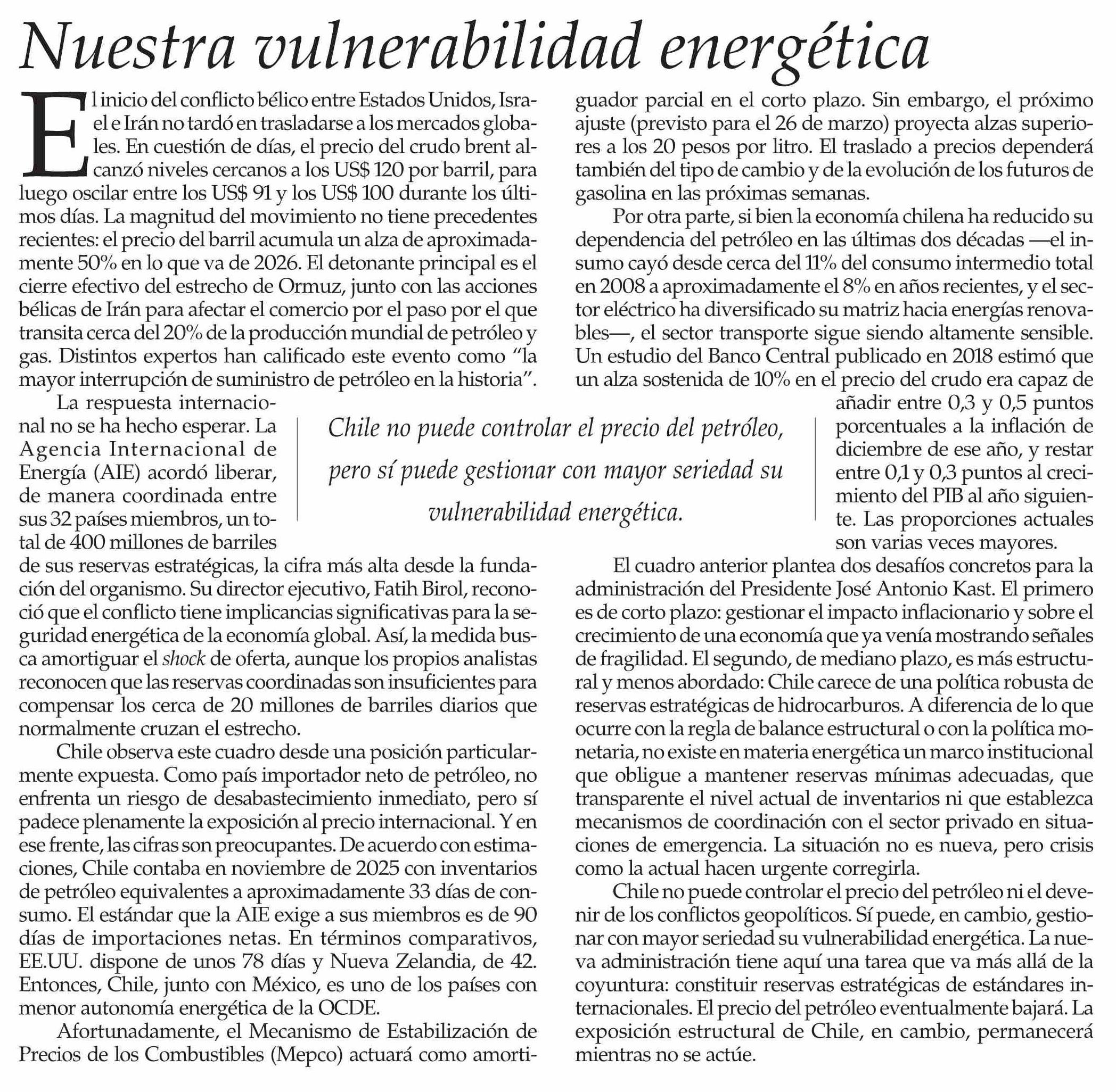 Editorial: Nuestra vulnerabilidad energética 13-03-2026 El Mercurio |