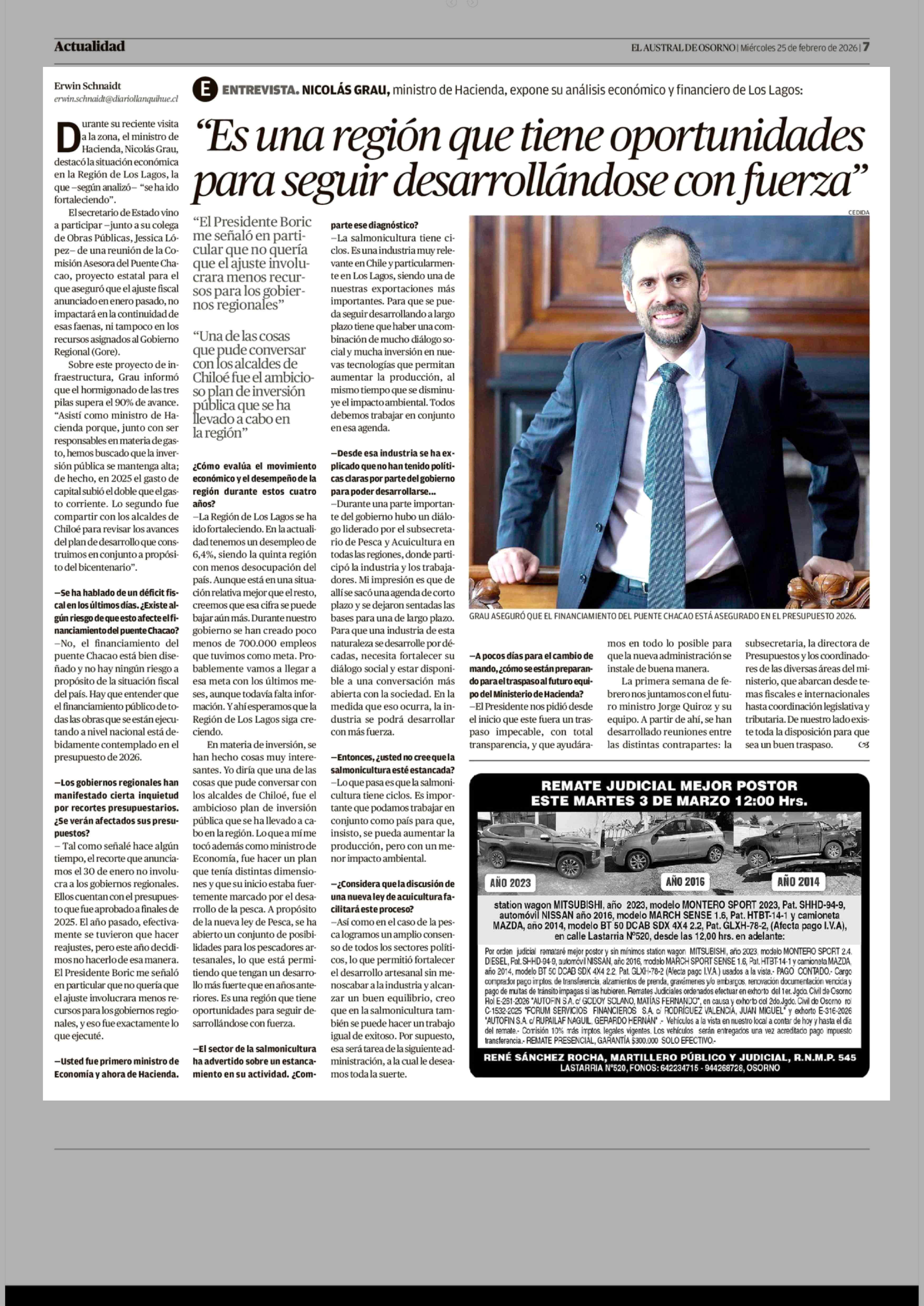 "Es una región que tiene oportunidades para seguir desarrollándose con fuerza" 25-02-2026 El Austral de Osorno |