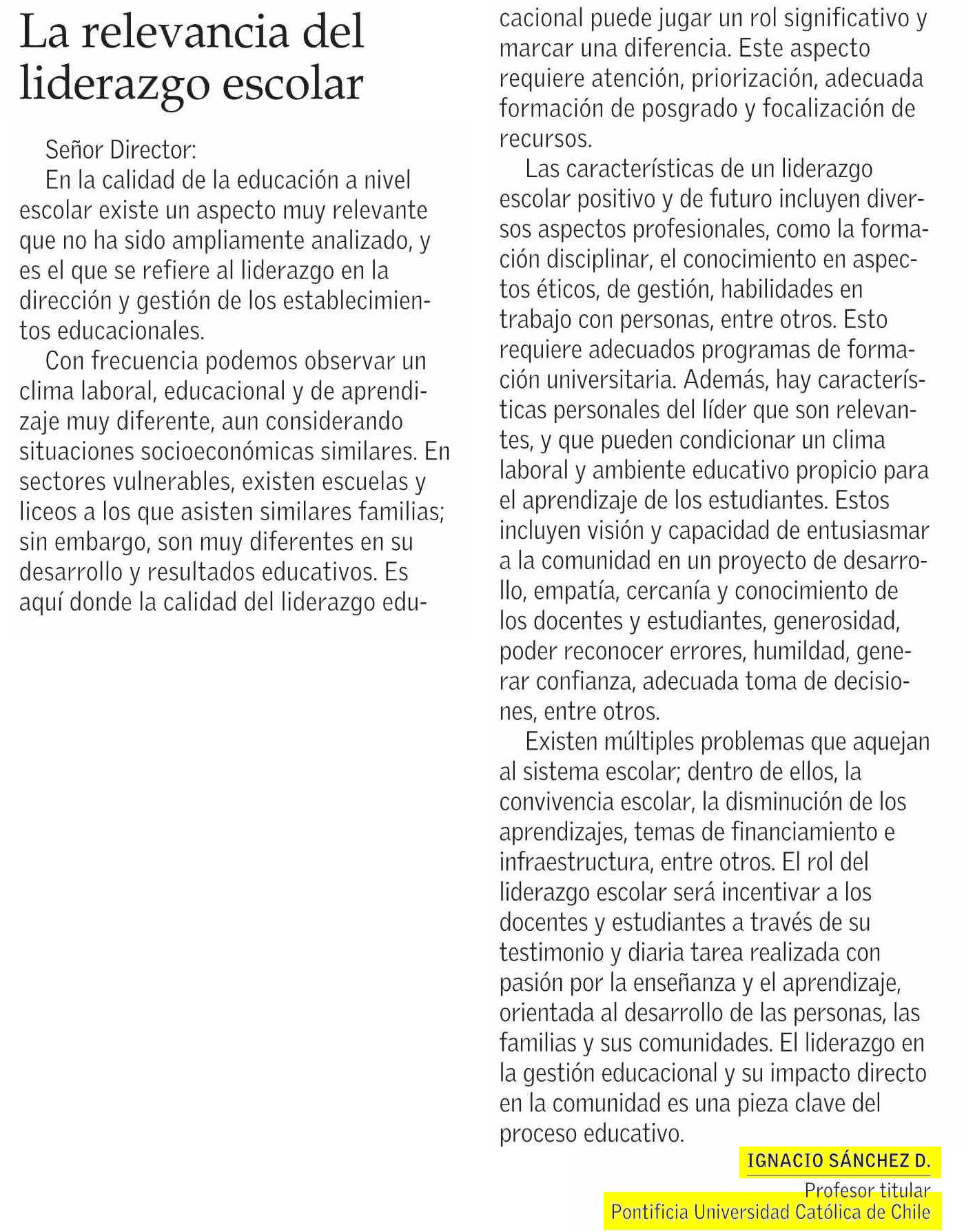 CARTAS: La relevancia del liderazgo escolar 20-05-2025 El Mercurio |