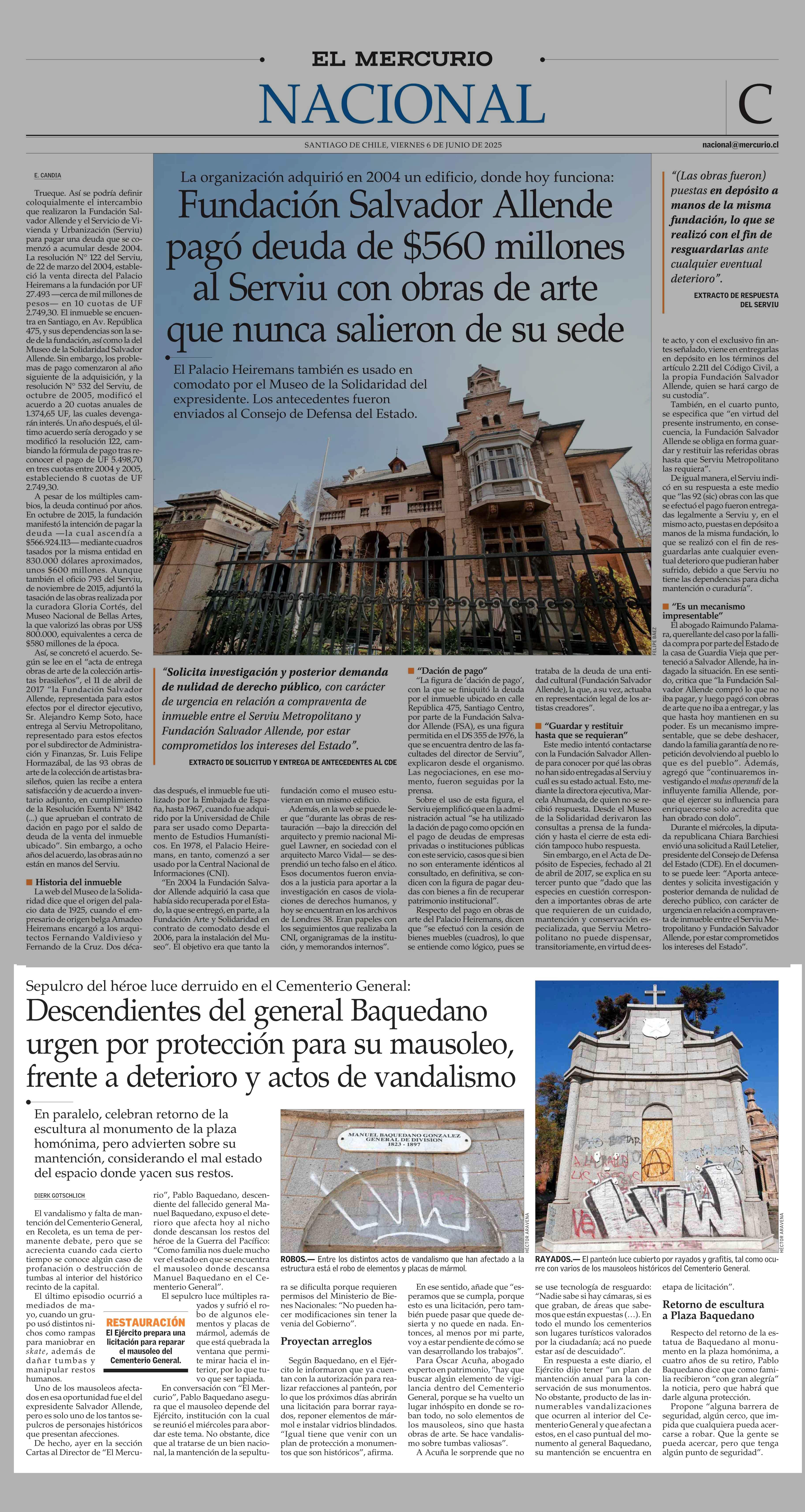 Descendientes del general Baquedano urgen por protección para su mausoleo, frente a deterioro y actos de vandalismo 06-06-2025 El Mercurio |