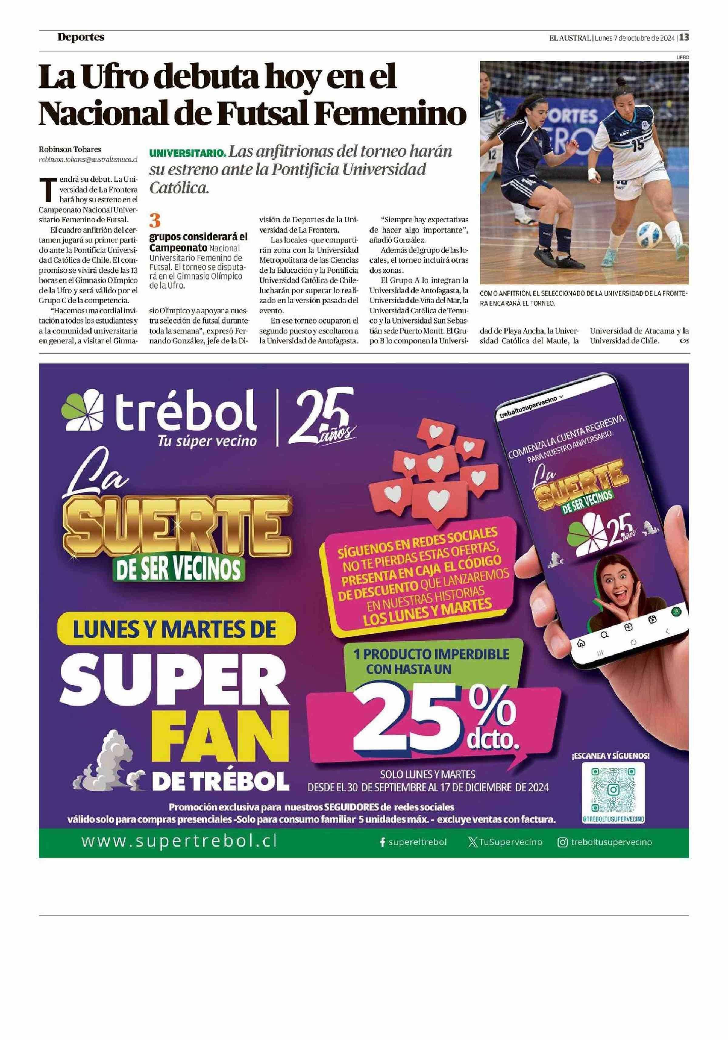 La Ufro debuta hoy en el Nacional de Futsal Femenino 07-10-2024 El Austral de la Araucanía |