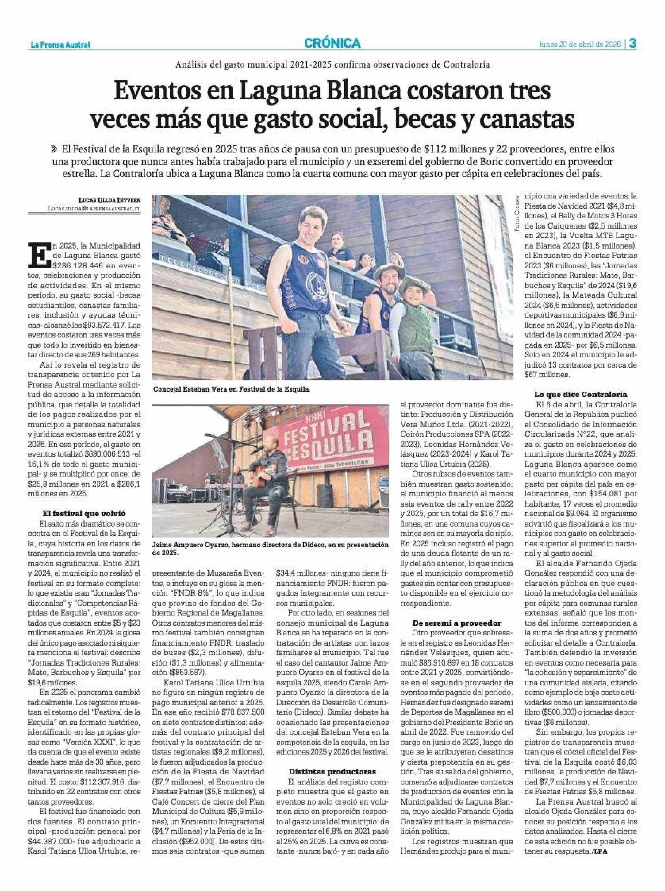 Eventos en Laguna Blanca costaron tres veces más que gasto social, becas y canastas 20-04-2026 La Prensa Austral |