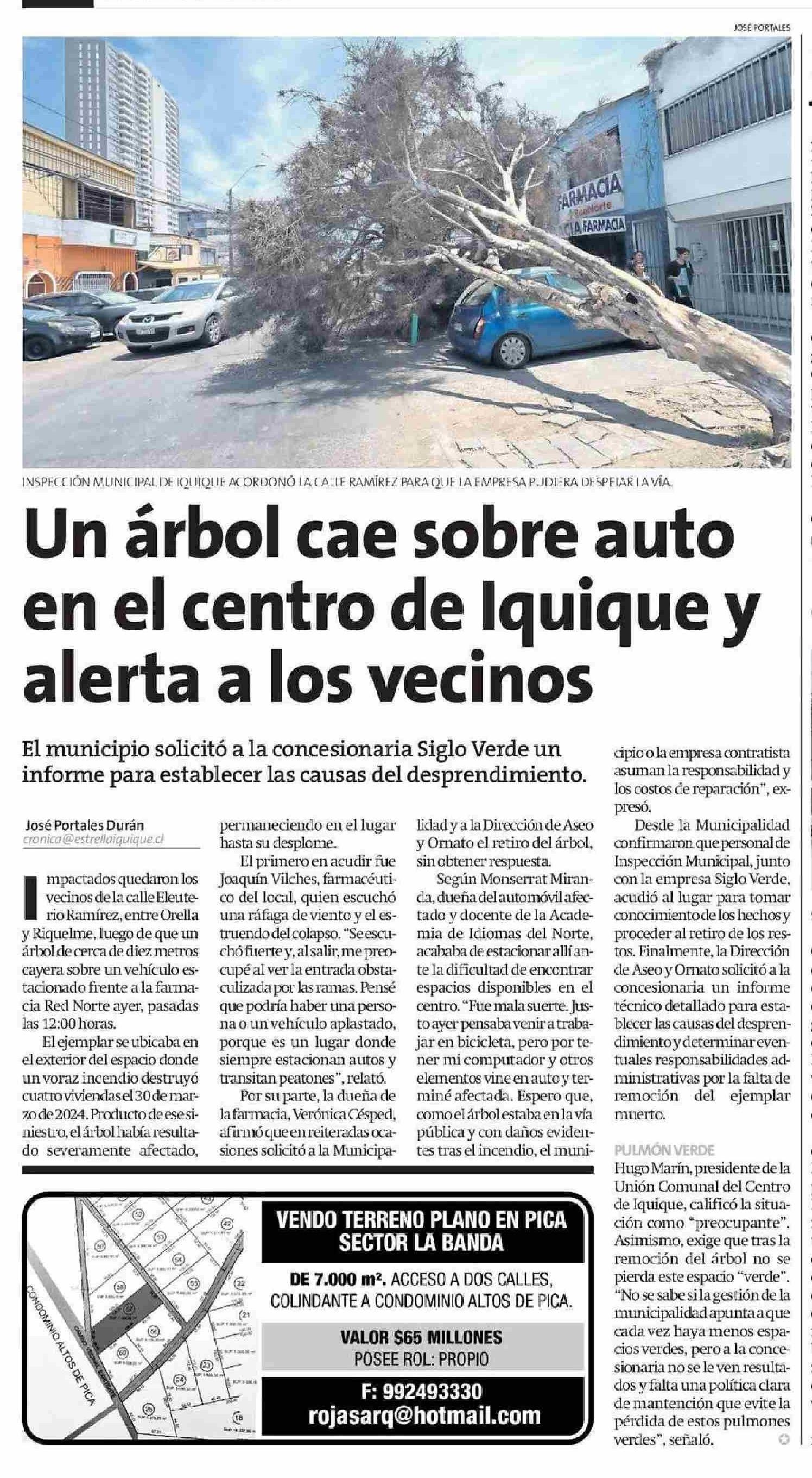 | Título: | Un árbol cae sobre auto en el centro de Iquique y alerta a los vecinos |