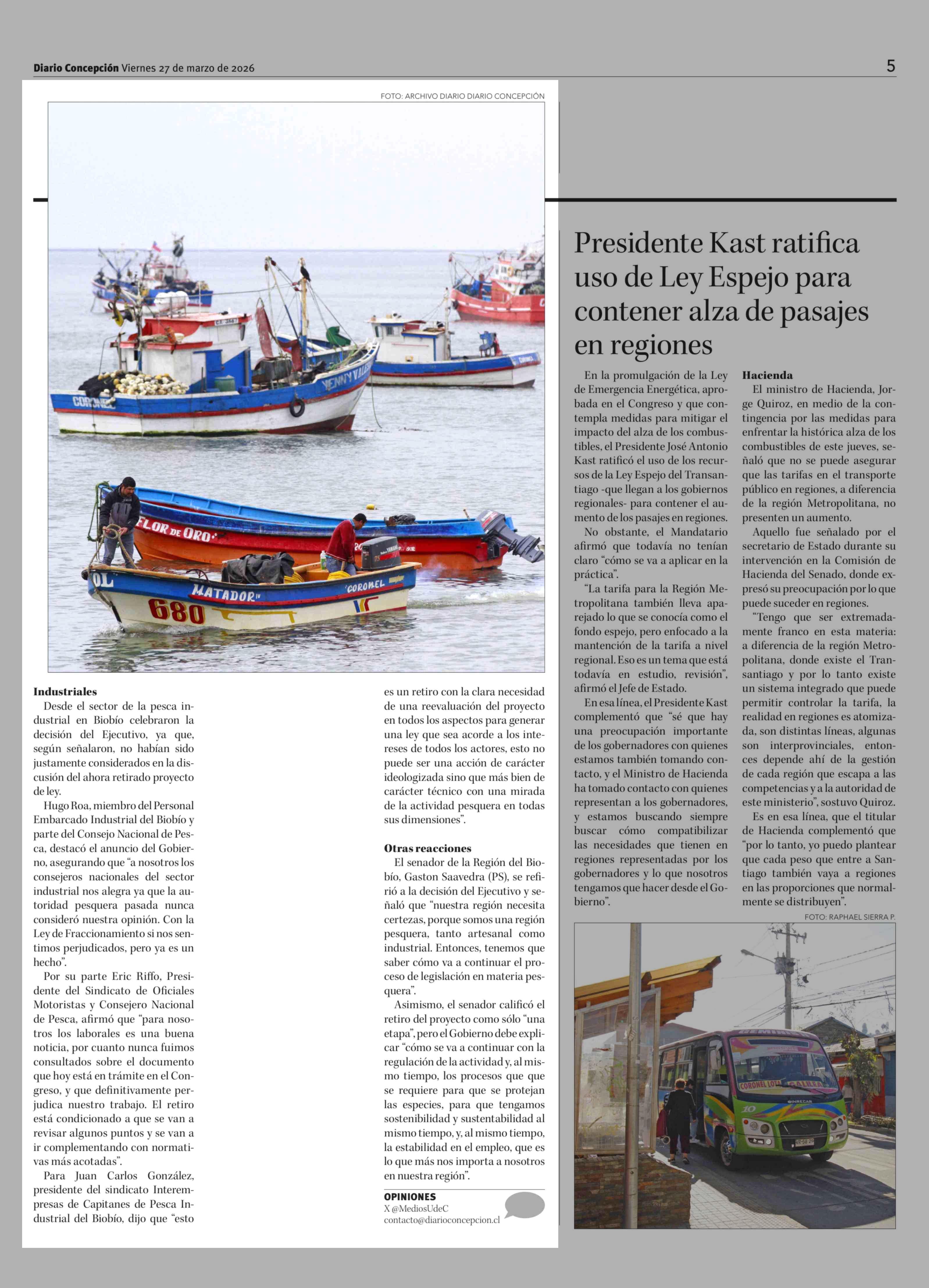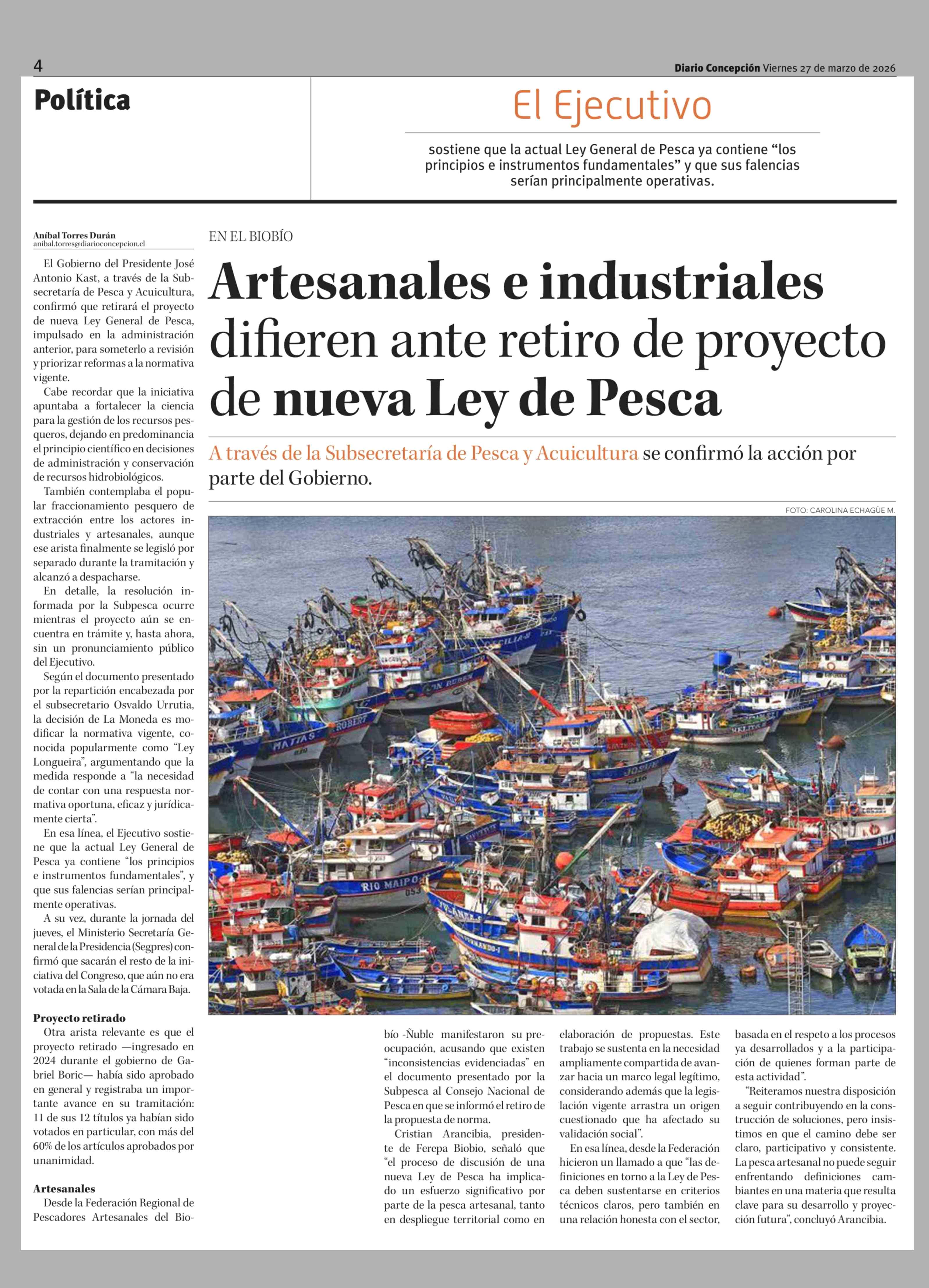 Artesanales e industriales difieren ante retiro de proyecto de nueva Ley de Pesca 27-03-2026 Diario Concepción |