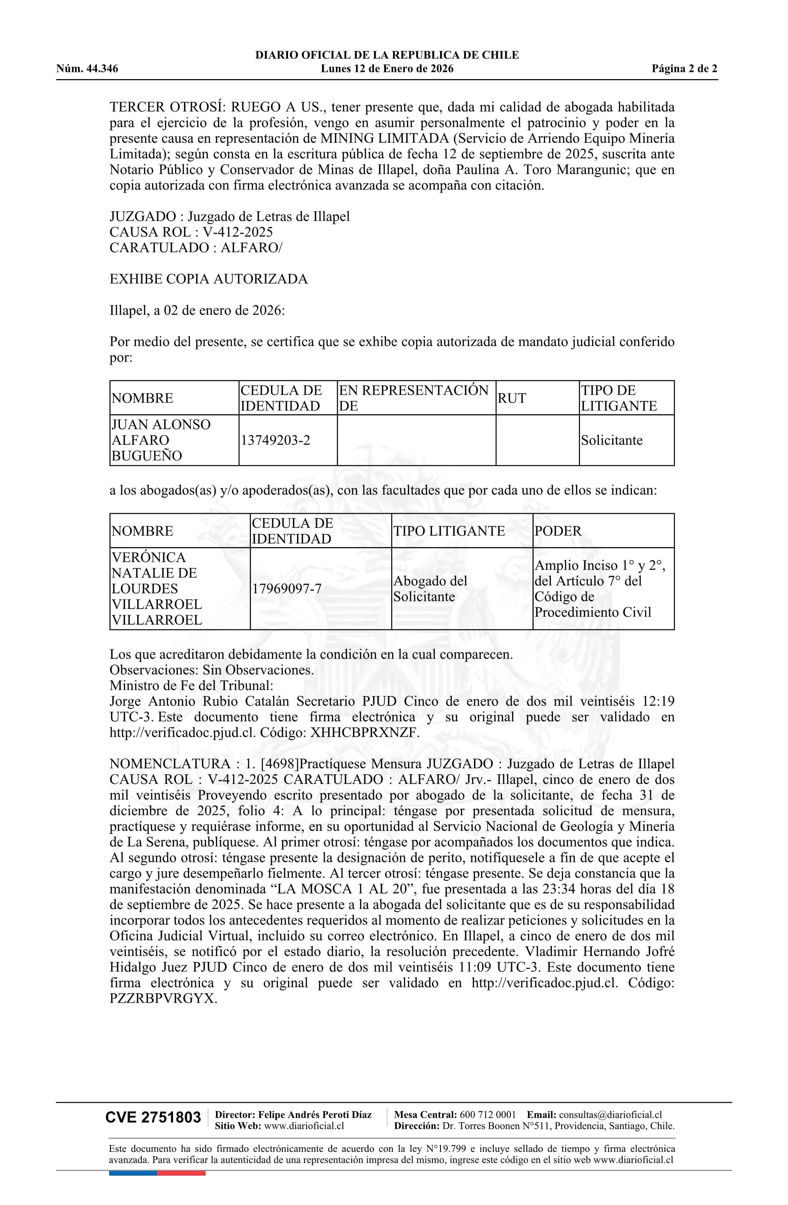 | Fuente: | DIARIO OFICIAL CHILE - BOLETÍN OFICIAL DE MINERÍA (DIARIO OFICIAL CHILE – BOM – SOLICITUDES DE MENSUR) | Página(s): | 1-2 |
