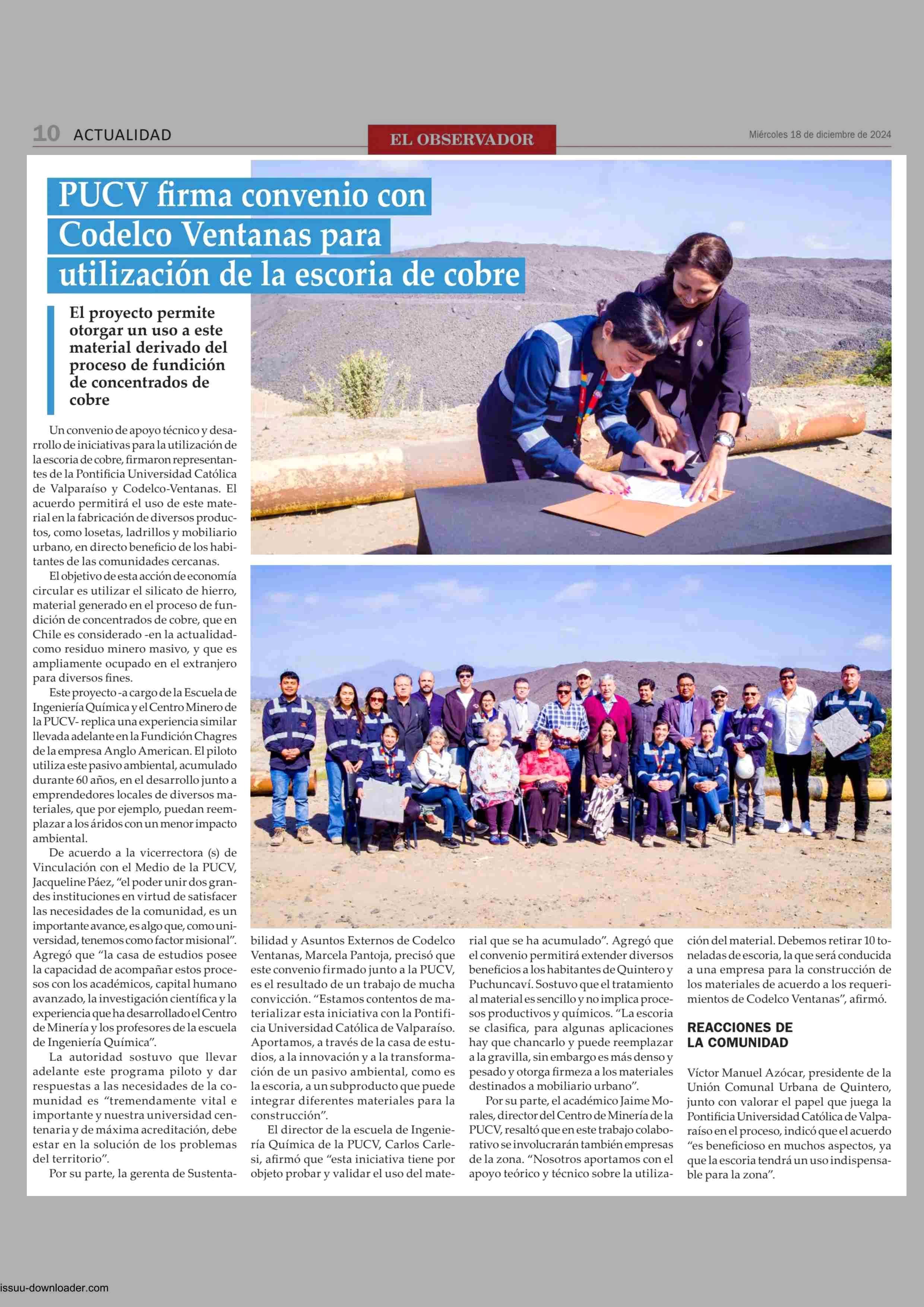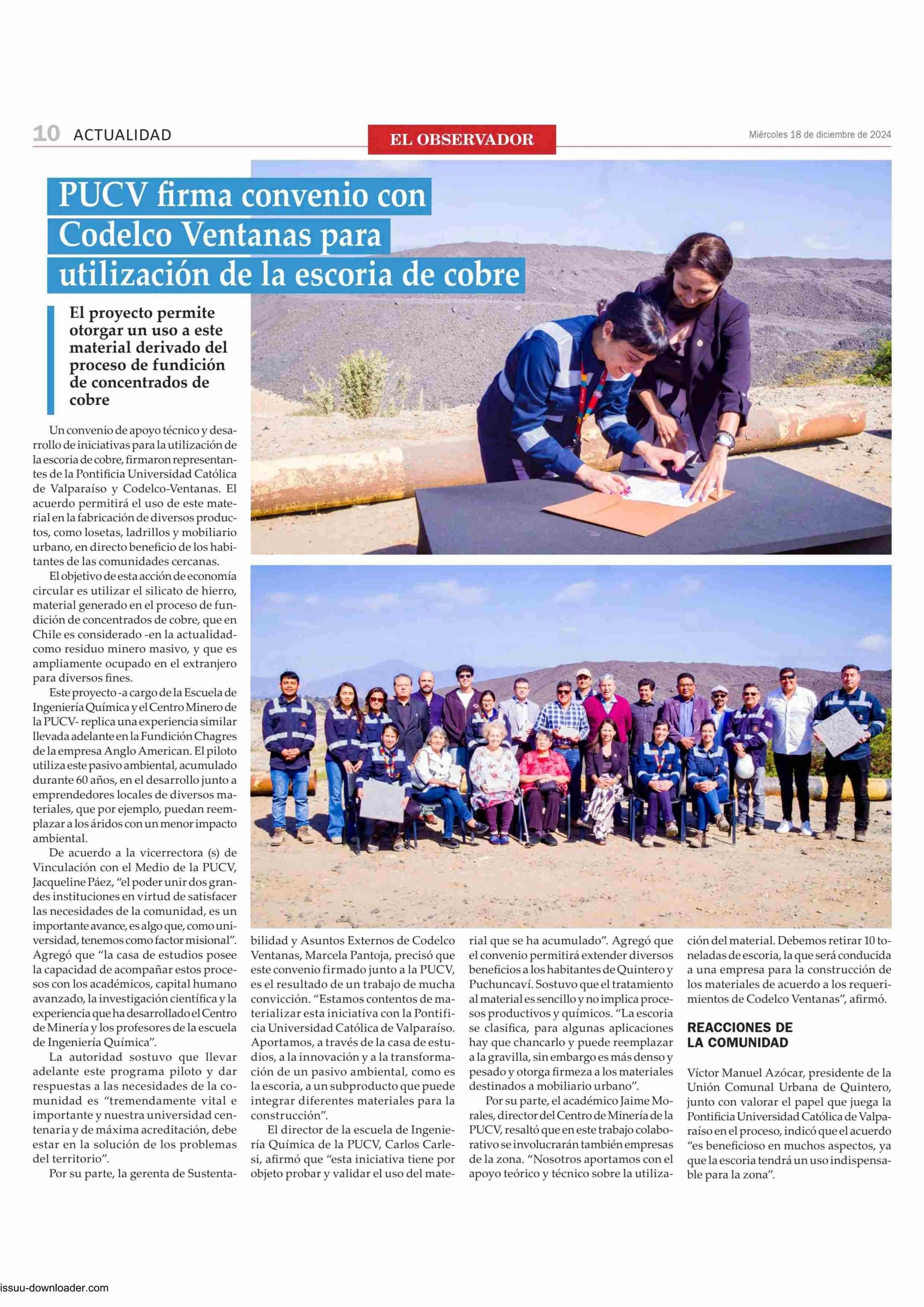 PUCV firma convenio con Codelco Ventanas para utilización de la escoria de cobre 18-12-2024 El Observador Vespertino |