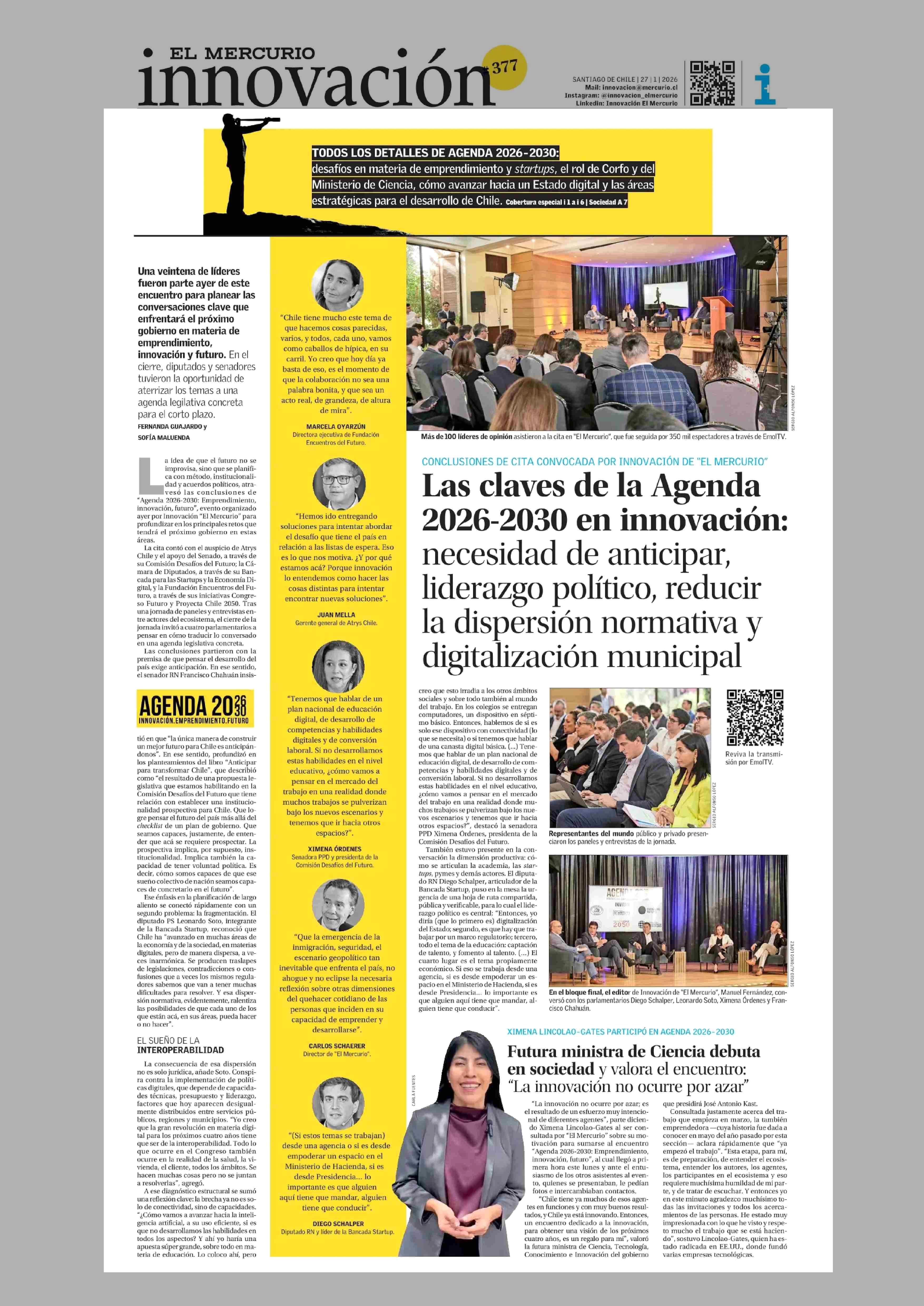 Las claves de la Agenda 2026-2030 en innovación: necesidad de anticipar, liderazgo político, reducir la dispersión normativa y digitalización municipal 27-01-2026 El Mercurio |