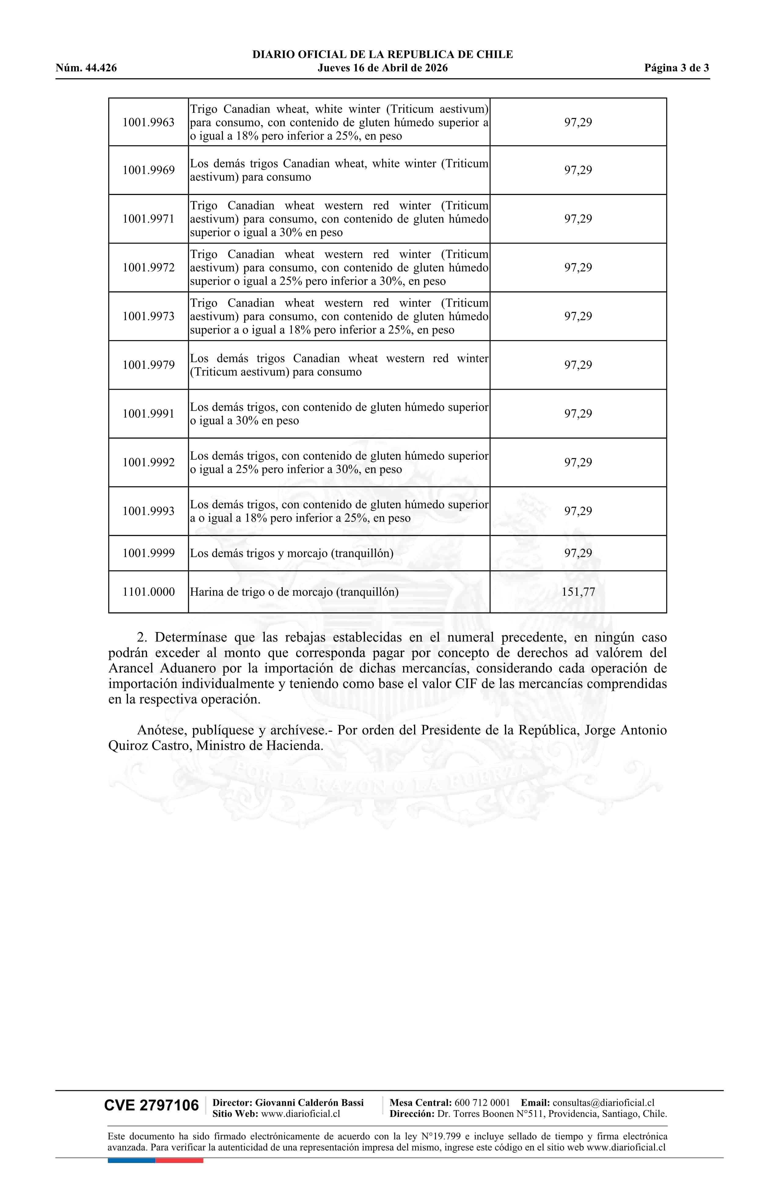 | Título: | Decreto exento número 120, de 2026.- Aplica rebajas de derechos de aduana para la importación de trigo y harina de trigo o de morcajo (tranquillón) |
