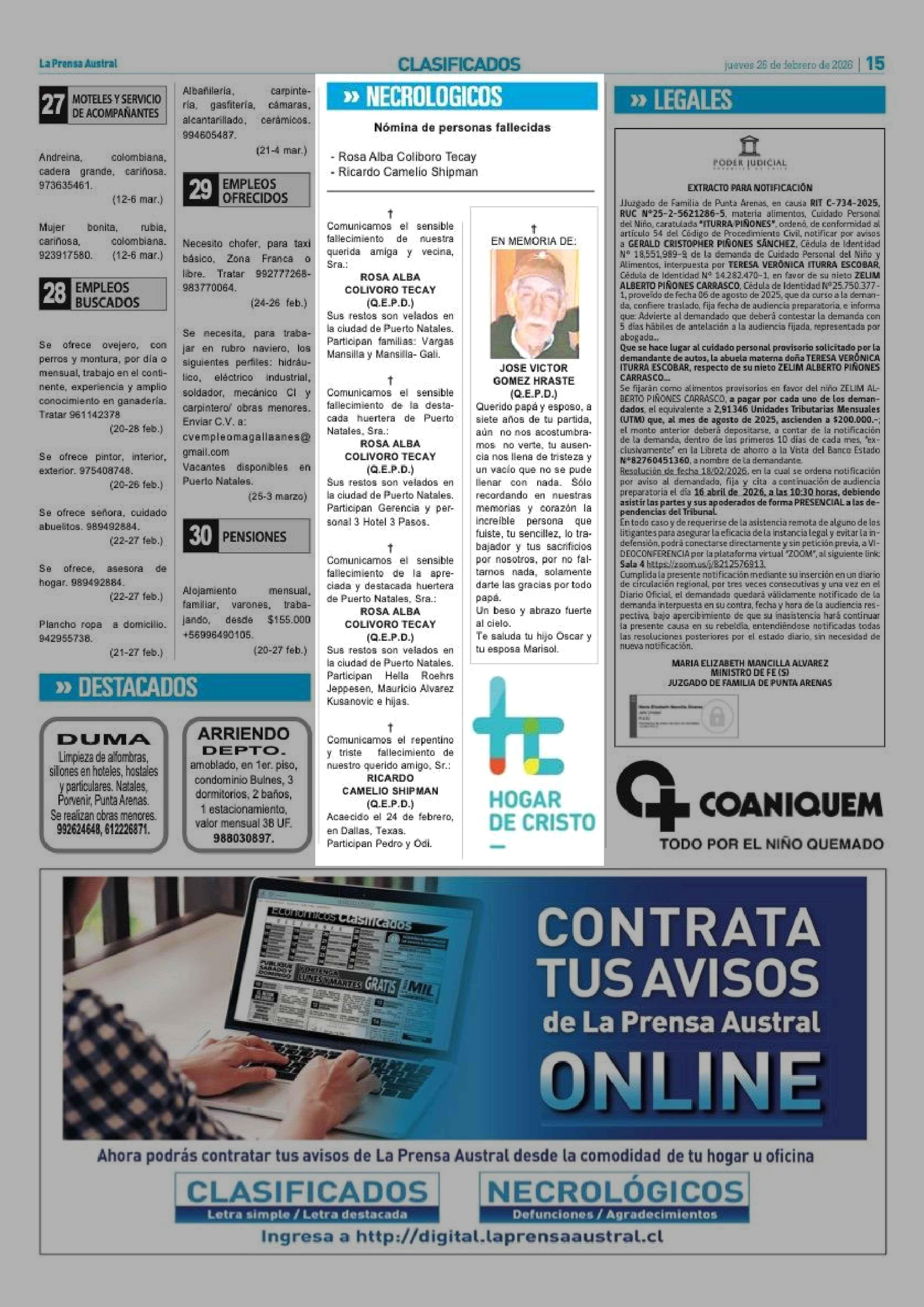 NECROLOGICOS 26-02-2026 La Prensa Austral |