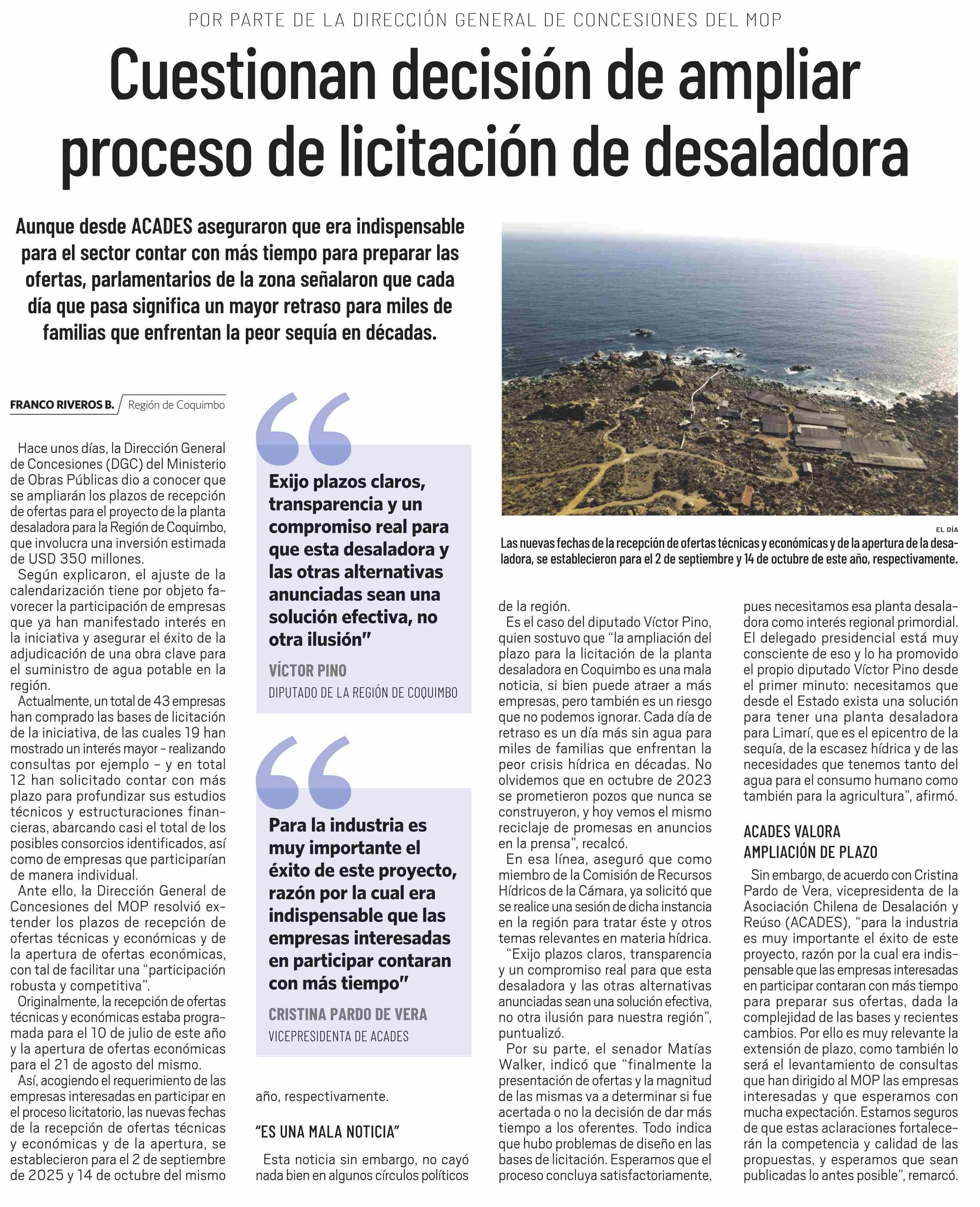 Cuestionan decisión de ampliar proceso de licitación de desaladora 11-06-2025 El Día |