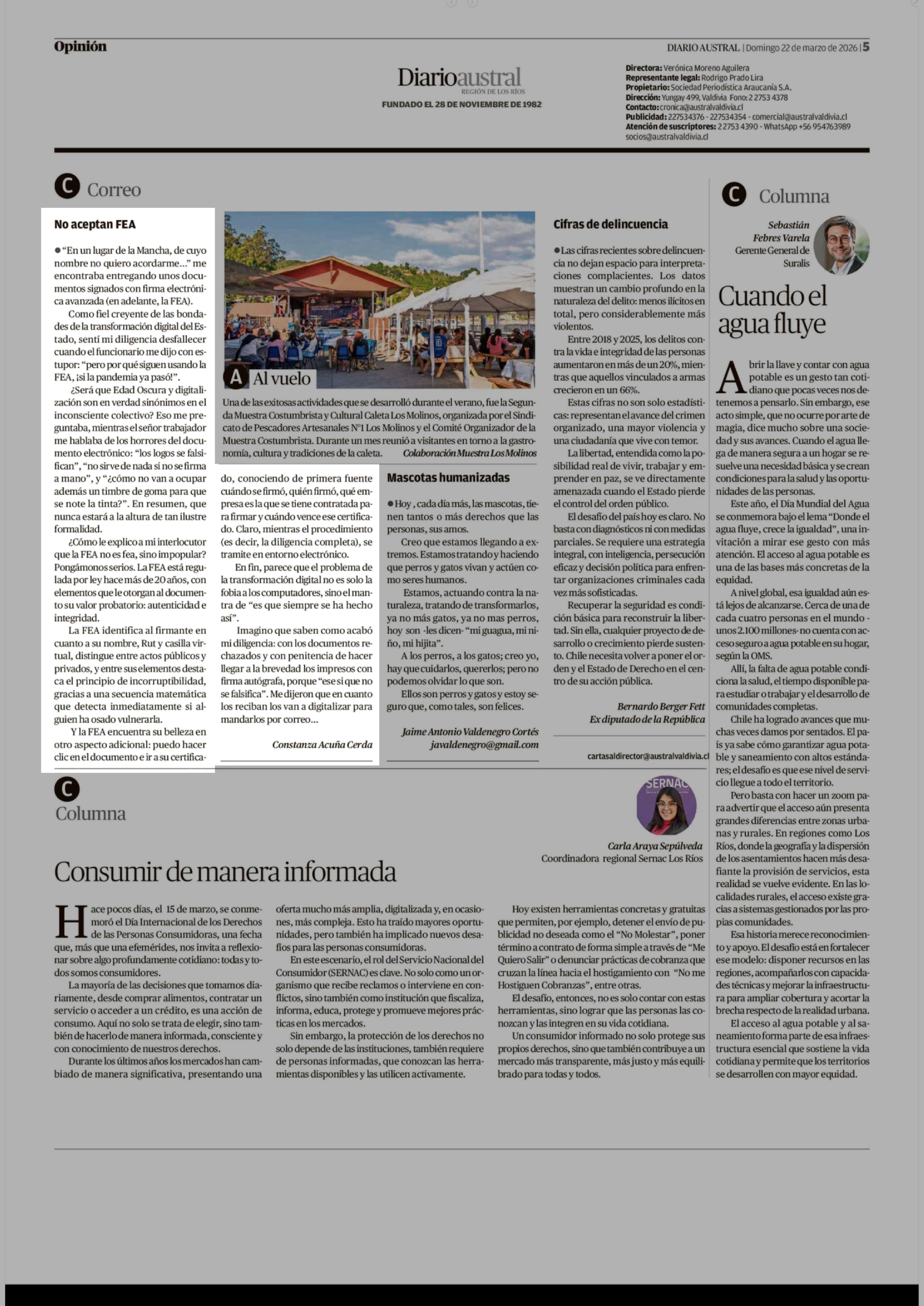CARTAS: No aceptan FEA 22-03-2026 Diario Austral Región de Los Ríos |