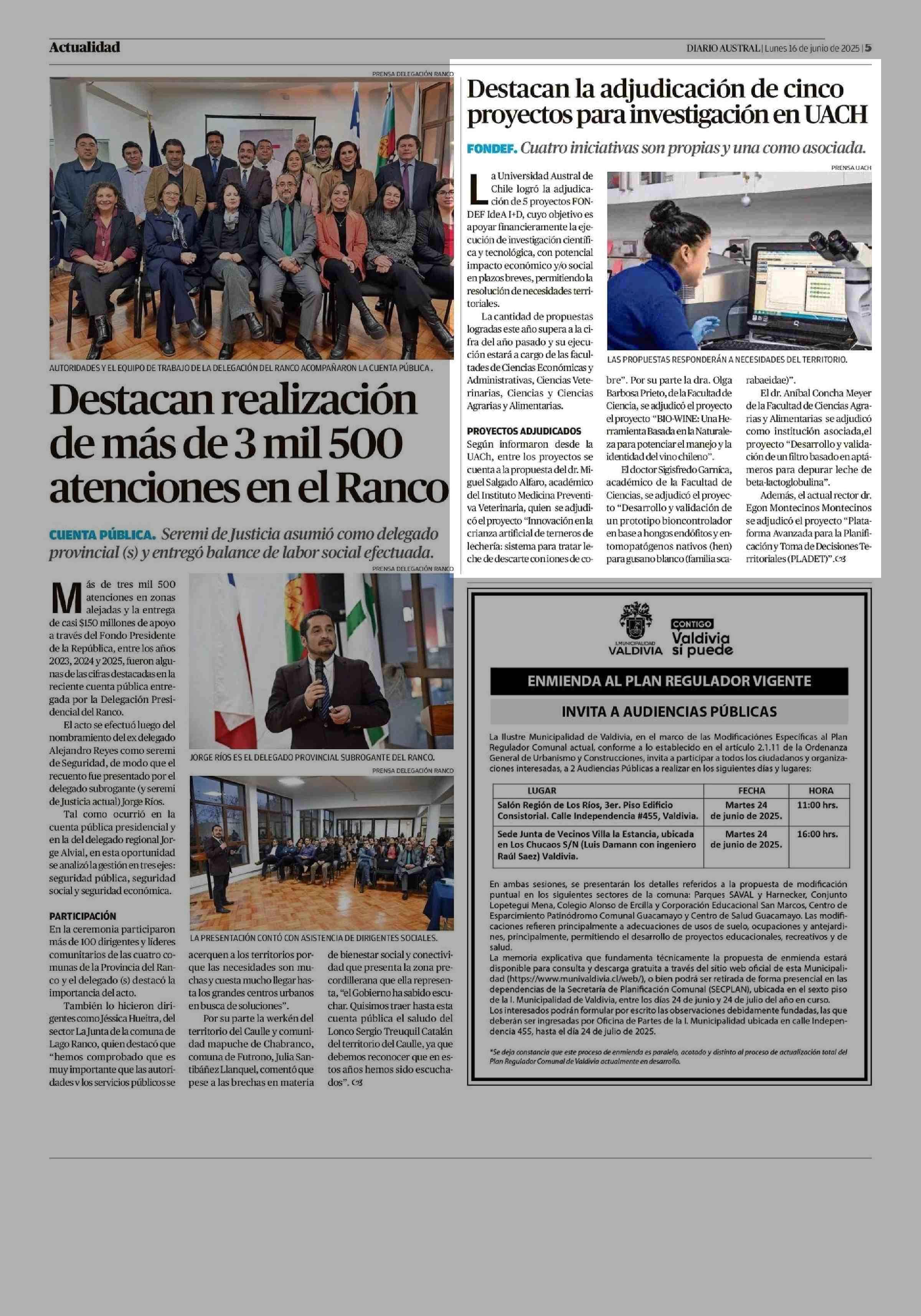 Destacan la adjudicación de cinco proyectos para investigación en UACH 16-06-2025 Diario Austral Región de Los Ríos |