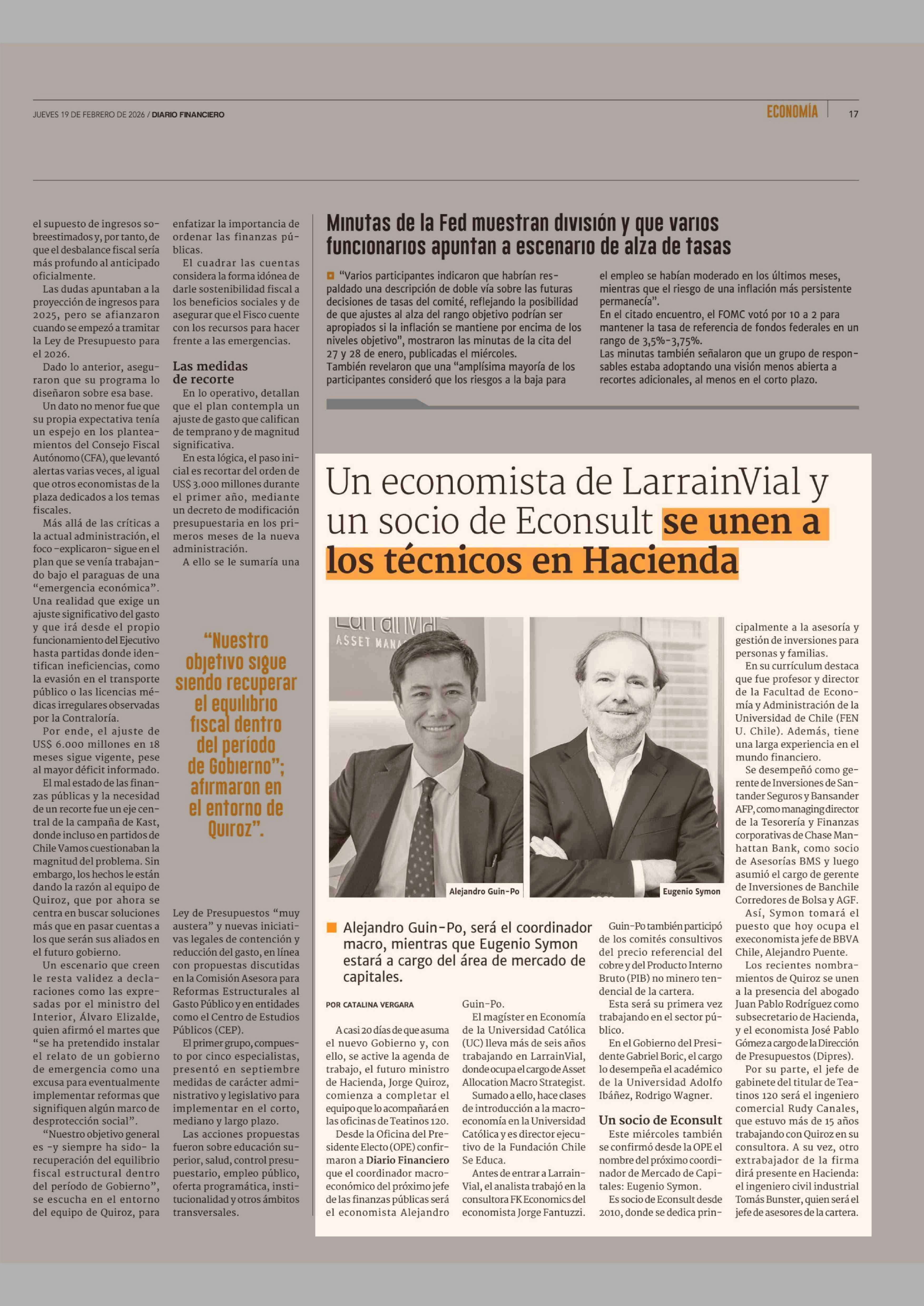 Un economista de LarrainVial y un socio de Econsult se unen a los técnicos en Hacienda 19-02-2026 Diario Financiero |