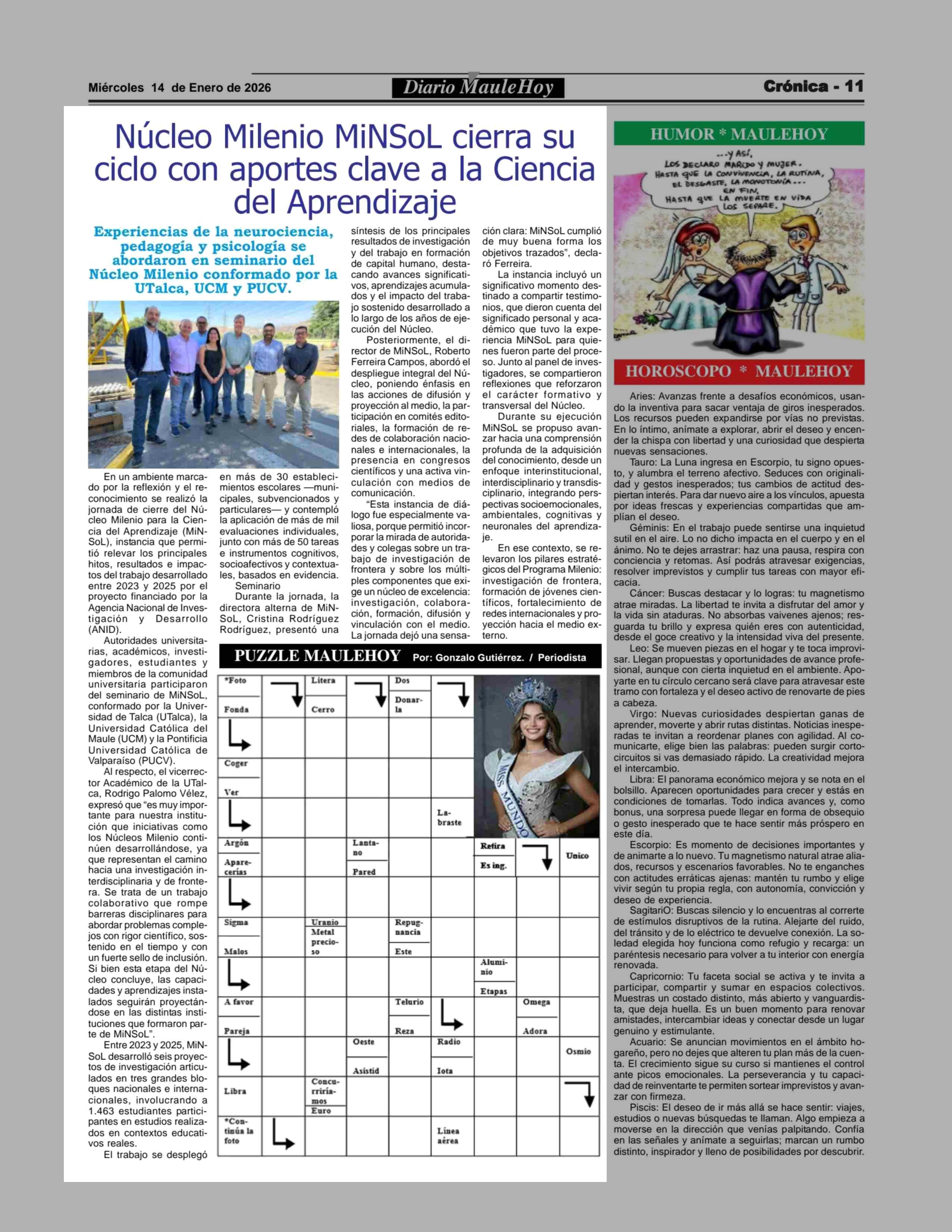 Núcleo Milenio MiNSoL cierra su ciclo con aportes clave a la Ciencia del Aprendizaje 14-01-2026 Maule Hoy |
