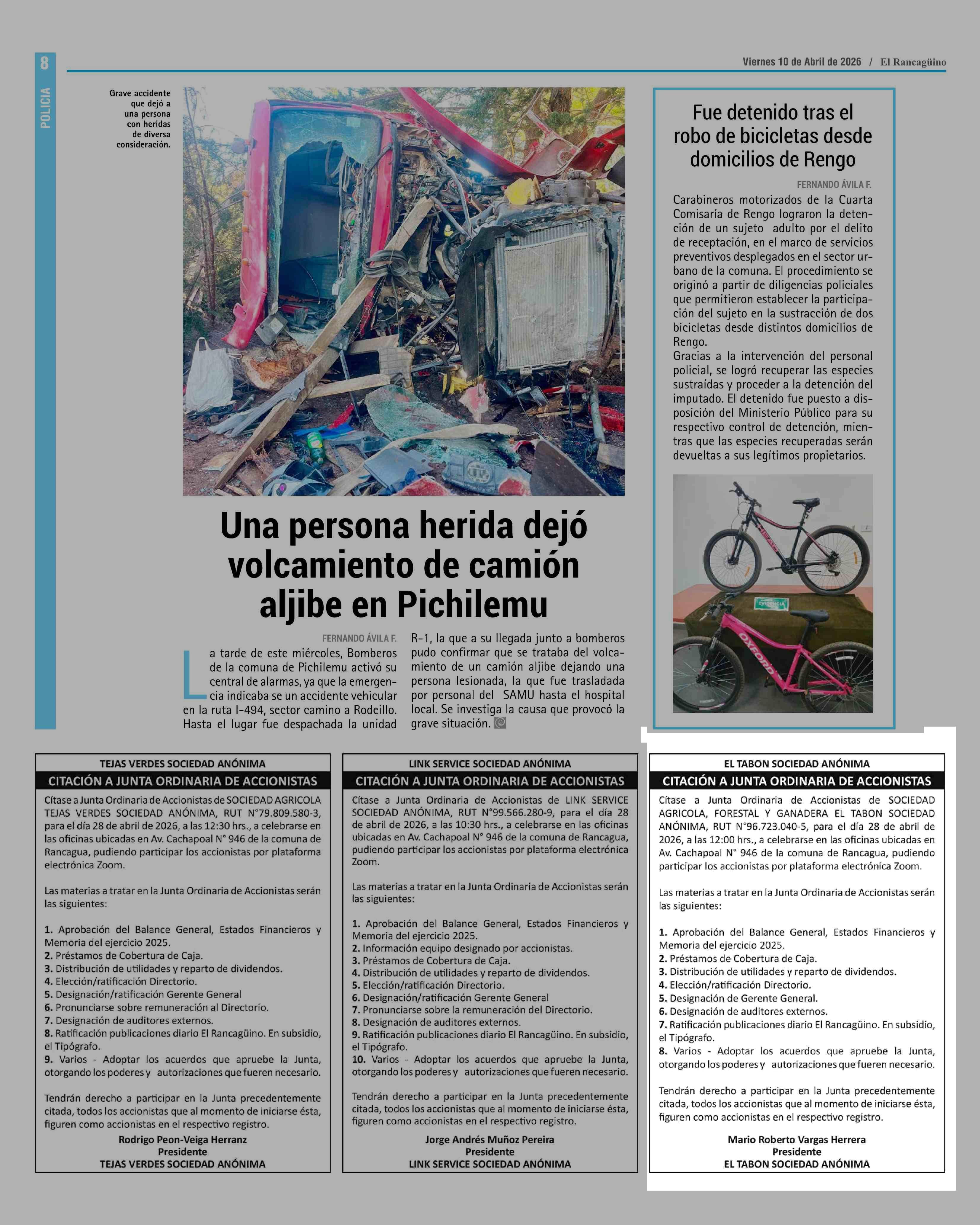CITACIÓN SOCIEDAD AGRICOLA, FORESTAL Y GANADERA El TABON SOCIEDAD ANÓNIMA 10-04-2026 El Rancagüino |