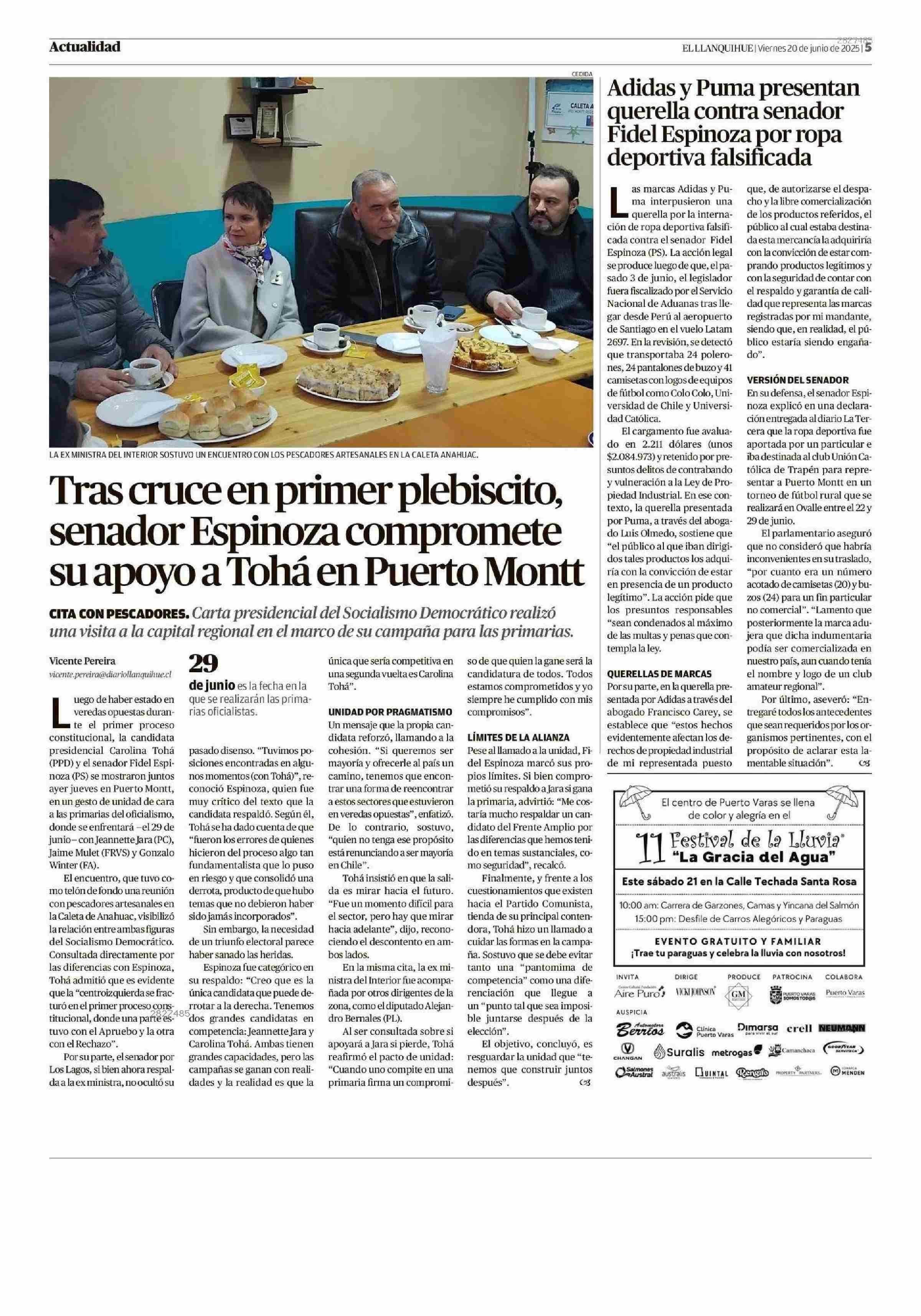 Tras cruce en primer plebiscito, senador Espinoza compromete su apoyo a Tohá en Puerto Montt 20-06-2025 El Llanquihue |