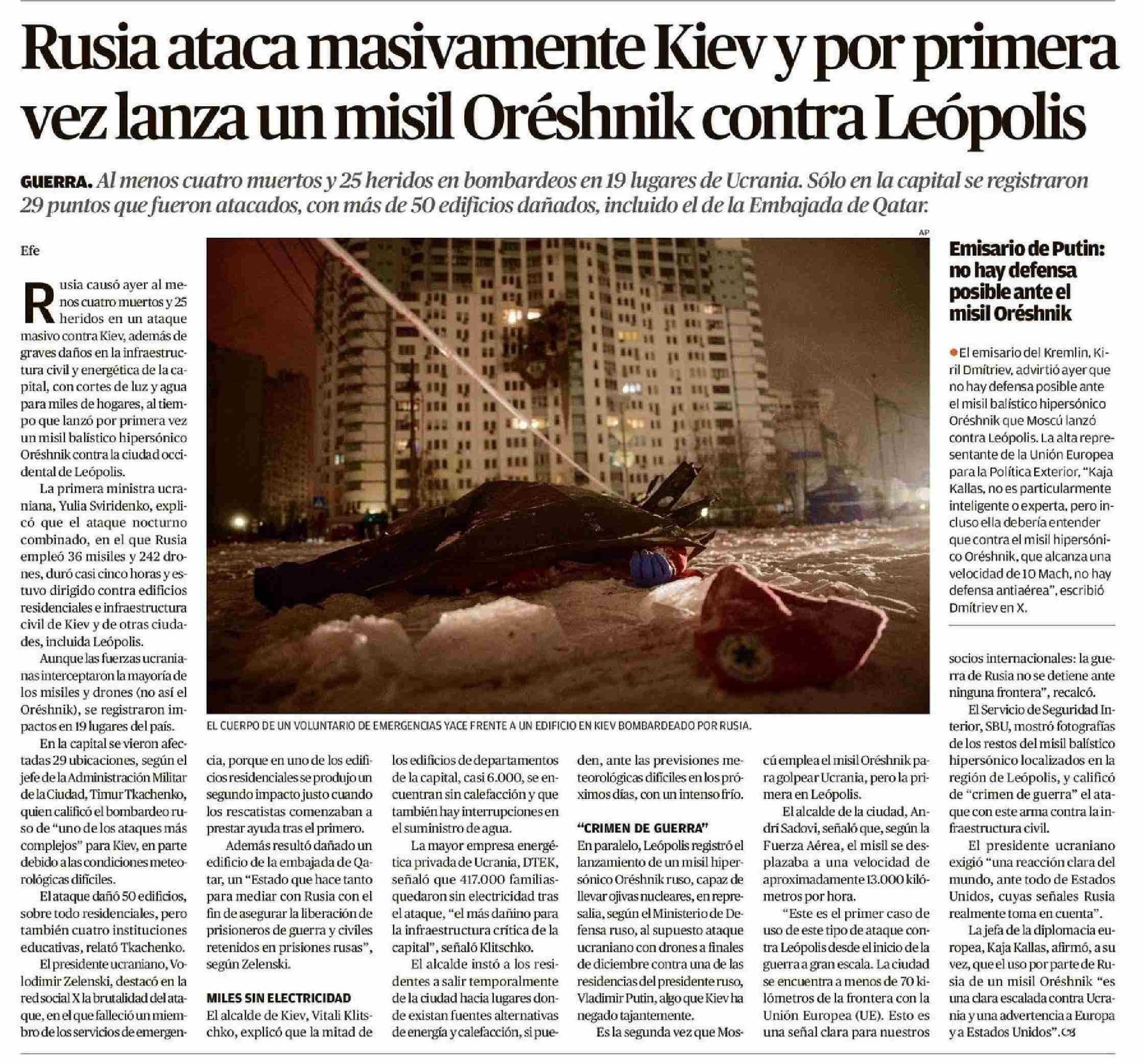 | Título: | Rusia ataca masivamente Kiev y por primera vez lanza un misil Oréshnik contra Leópolis |