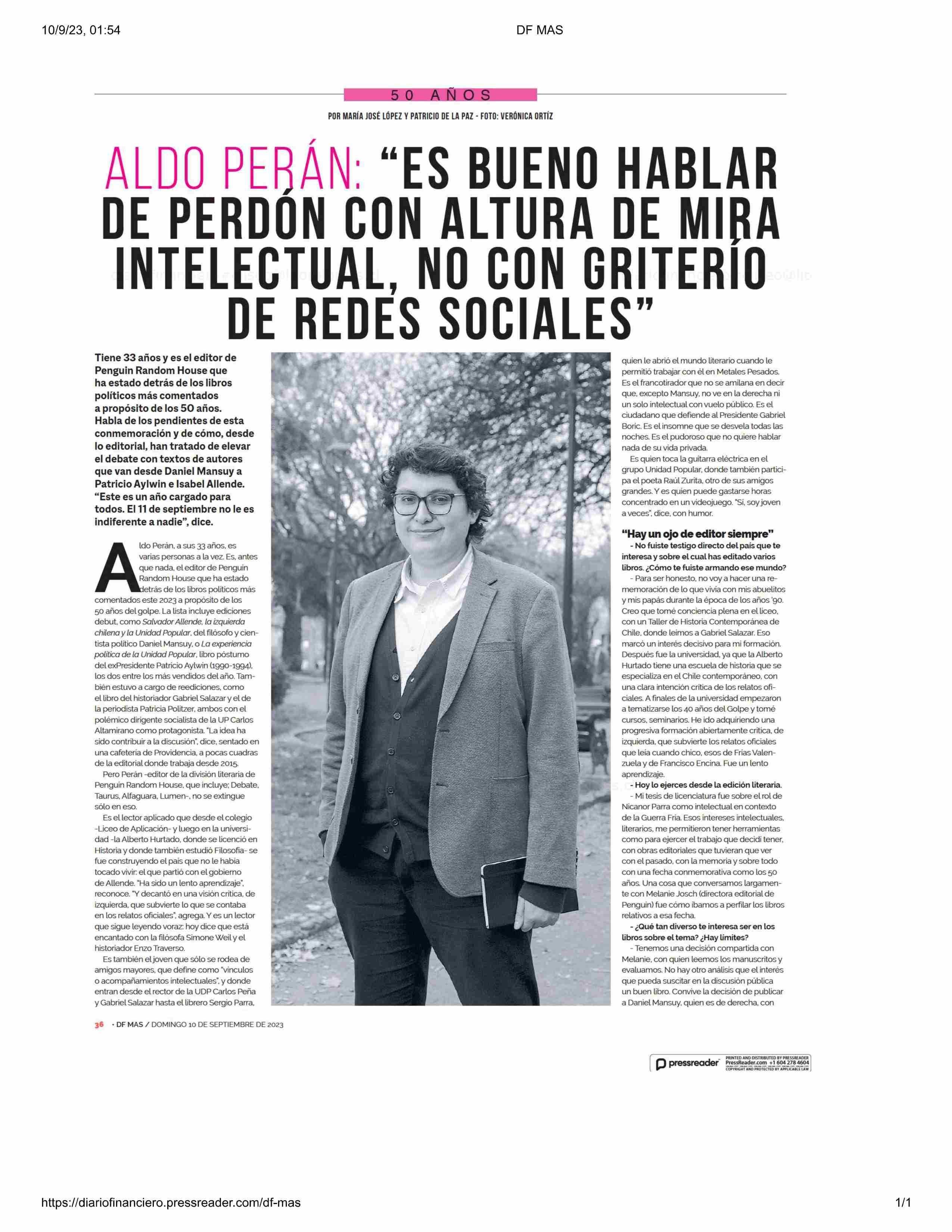 ALDO PERÁN: “ES BUENO HABLAR DE PERDON CON ALTURA DE MIRA INTELECTUAL, NO CON GRITERIO DE REDES SOCIALES” 10-09-2023 Diario Financiero |