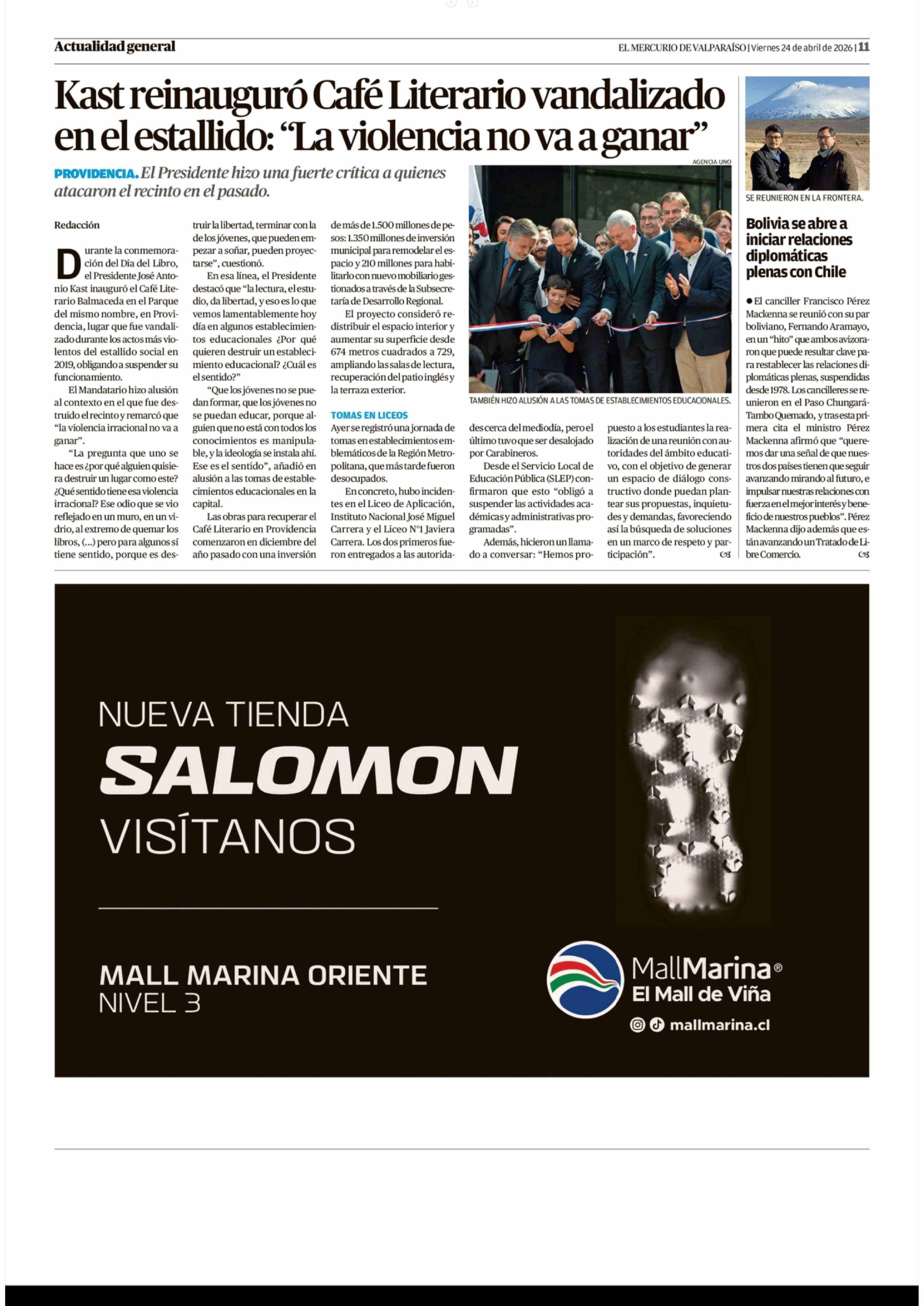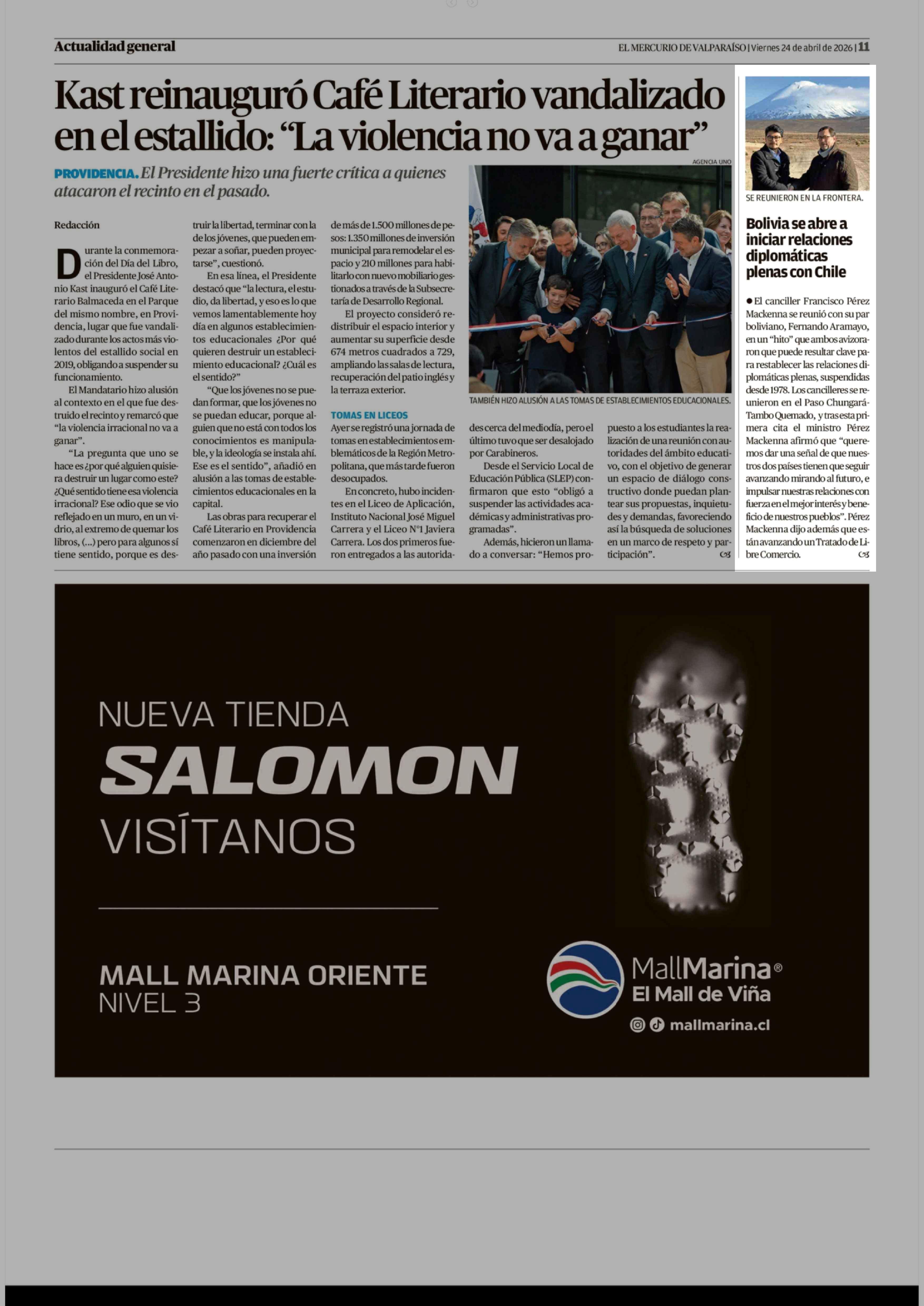Bolivia se abre a iniciar relaciones diplomáticas plenas con Chile 24-04-2026 El Mercurio de Valparaíso |