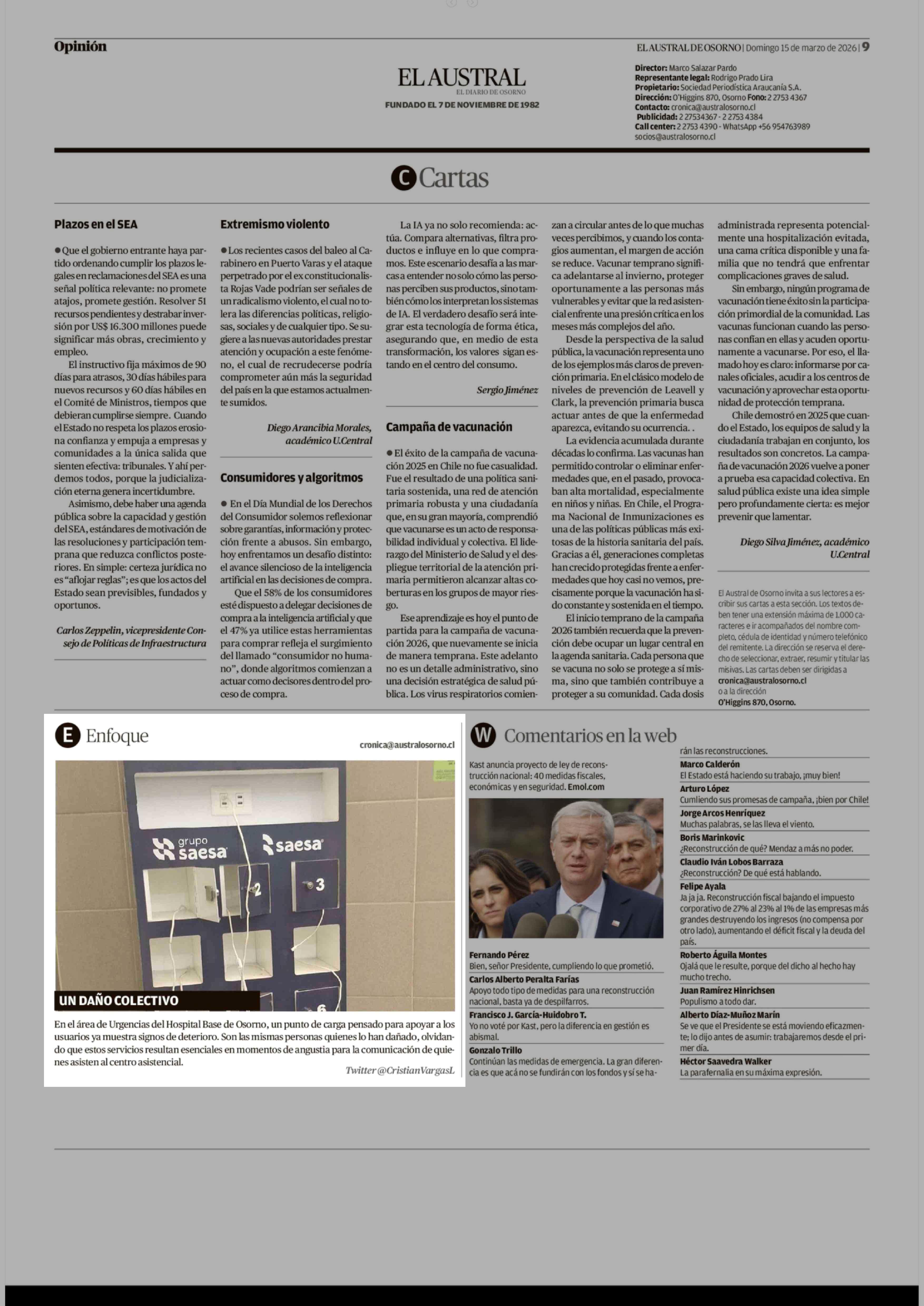 | Título: | En el área de Urgencias del Hospital Base de Osorno, un punto de carga pensado para apoyar a los usuarios ya muestra signos de deterioro. Son las mismas personas quienes lo han dañado, olvidando que estos servicios resultan esenciales en momentos de angustia para la comunicación de quienes asisten a |
