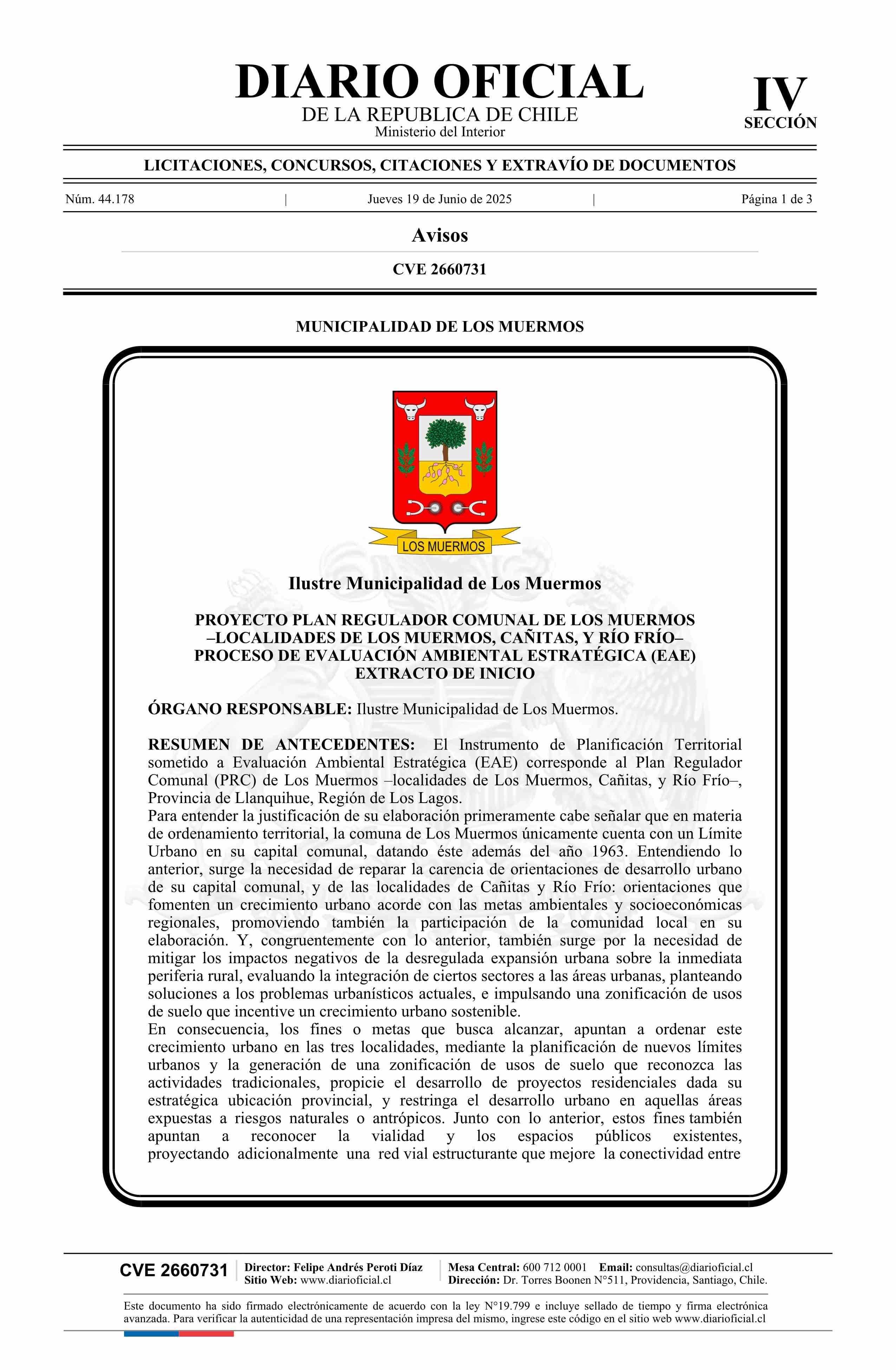 | Título: | AVISO LICITACIONES: Inicio proceso de Evaluación Ambiental Estratégica del proyecto Plan Regulador Comunal de Los Muermos -localidades de Los Muermos, Cañitas y Río Frío- proceso de Evaluación Ambiental Estratégica |