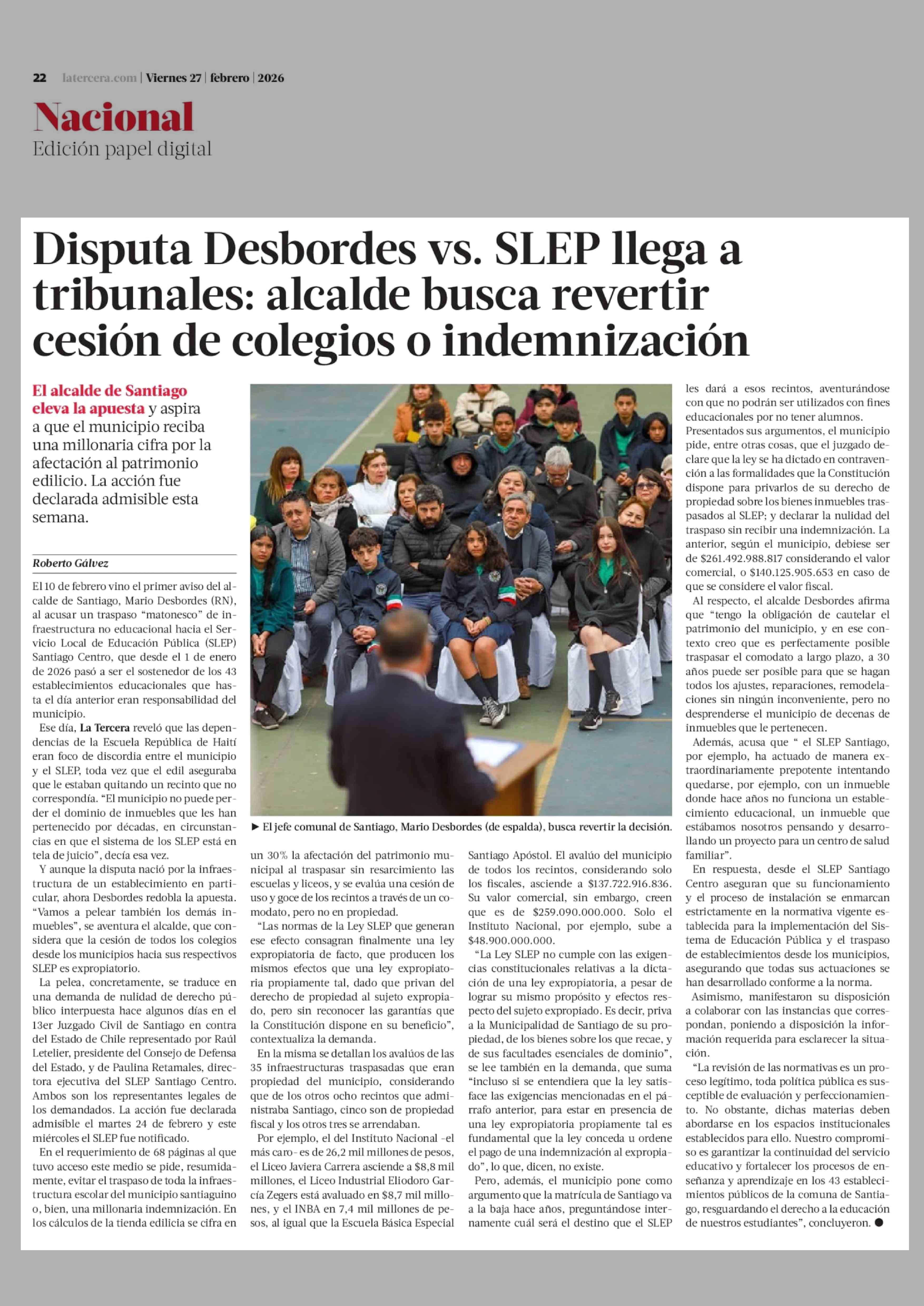 Título: Disputa Desbordes vs. SLEP llega a tribunales: alcalde busca revertir cesión de colegios o indemnización