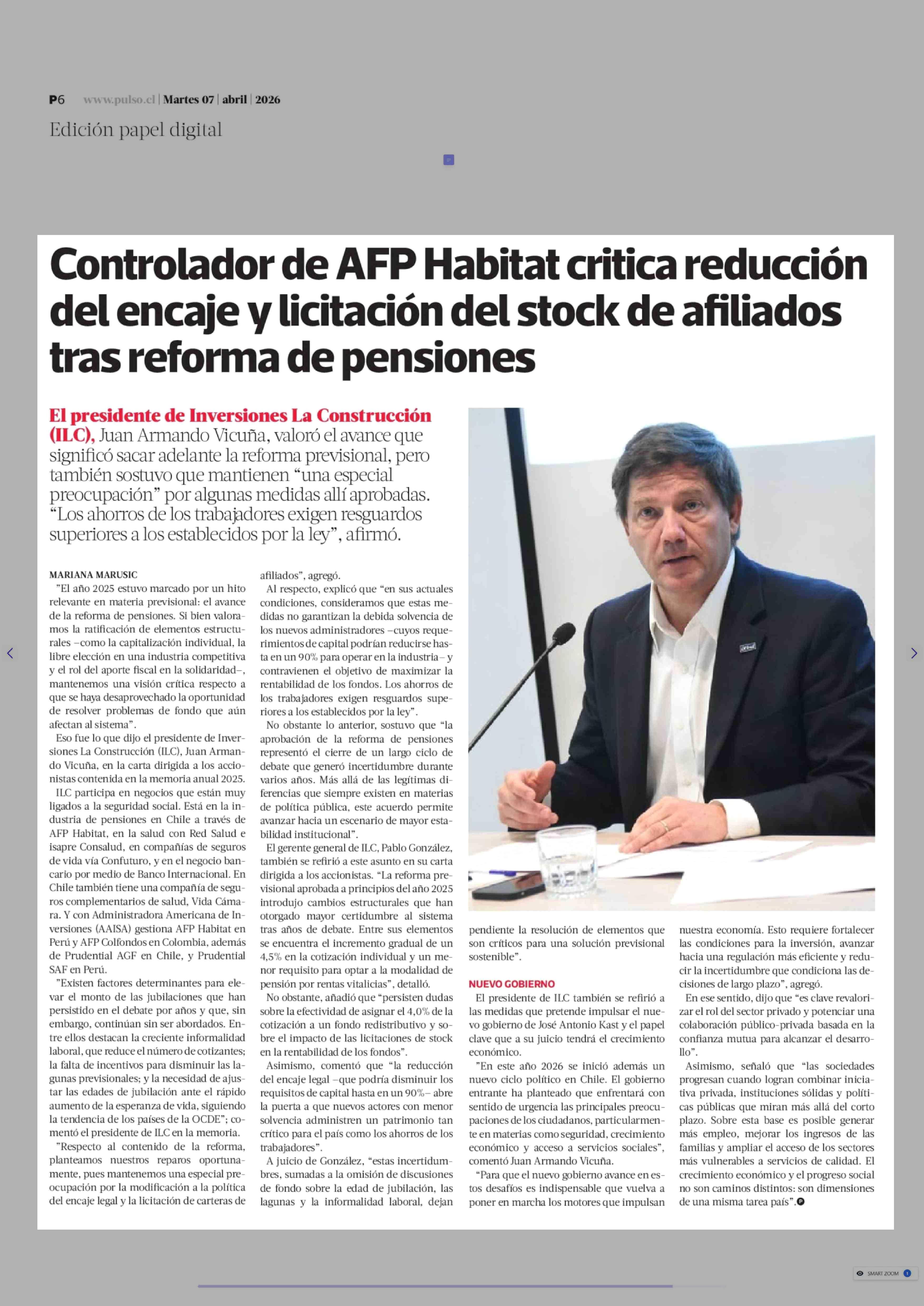 Controlador de AFP Habitat critica reducción del encaje y licitación del stock de afiliados tras reforma de pensiones 07-04-2026 La Tercera |