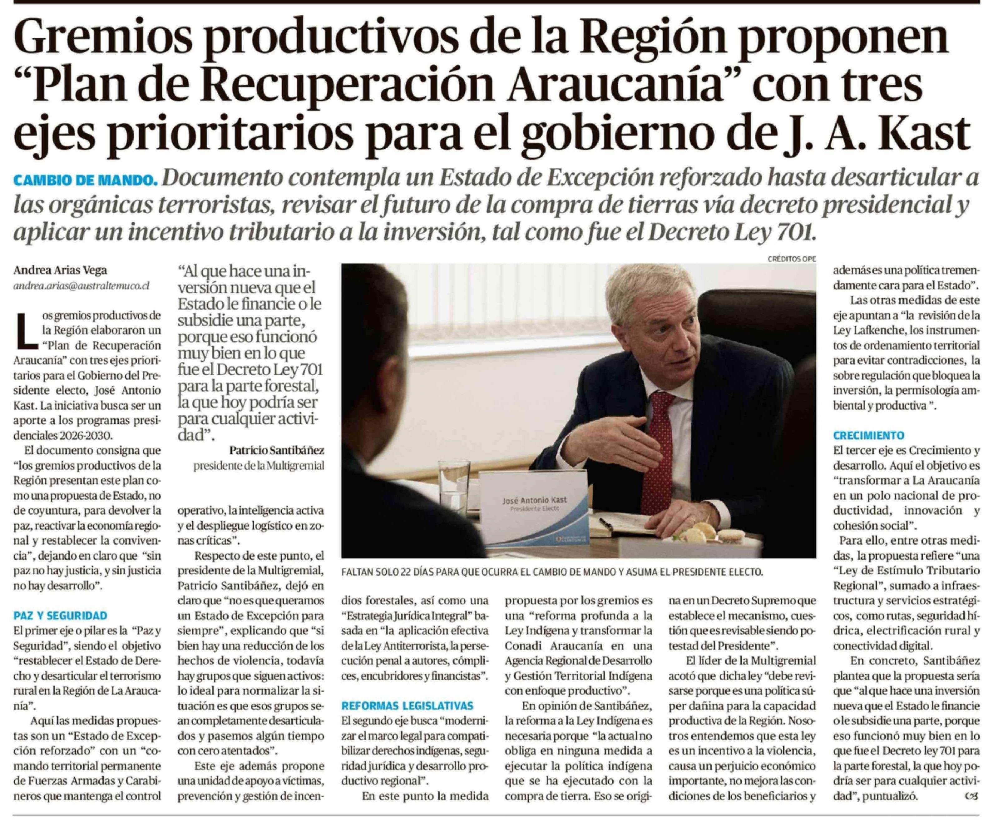 Título: Gremios productivos de la Región proponen "Plan de Recuperación Araucanía" con tres ejes prioritarios para el gobierno de J. A. Kast