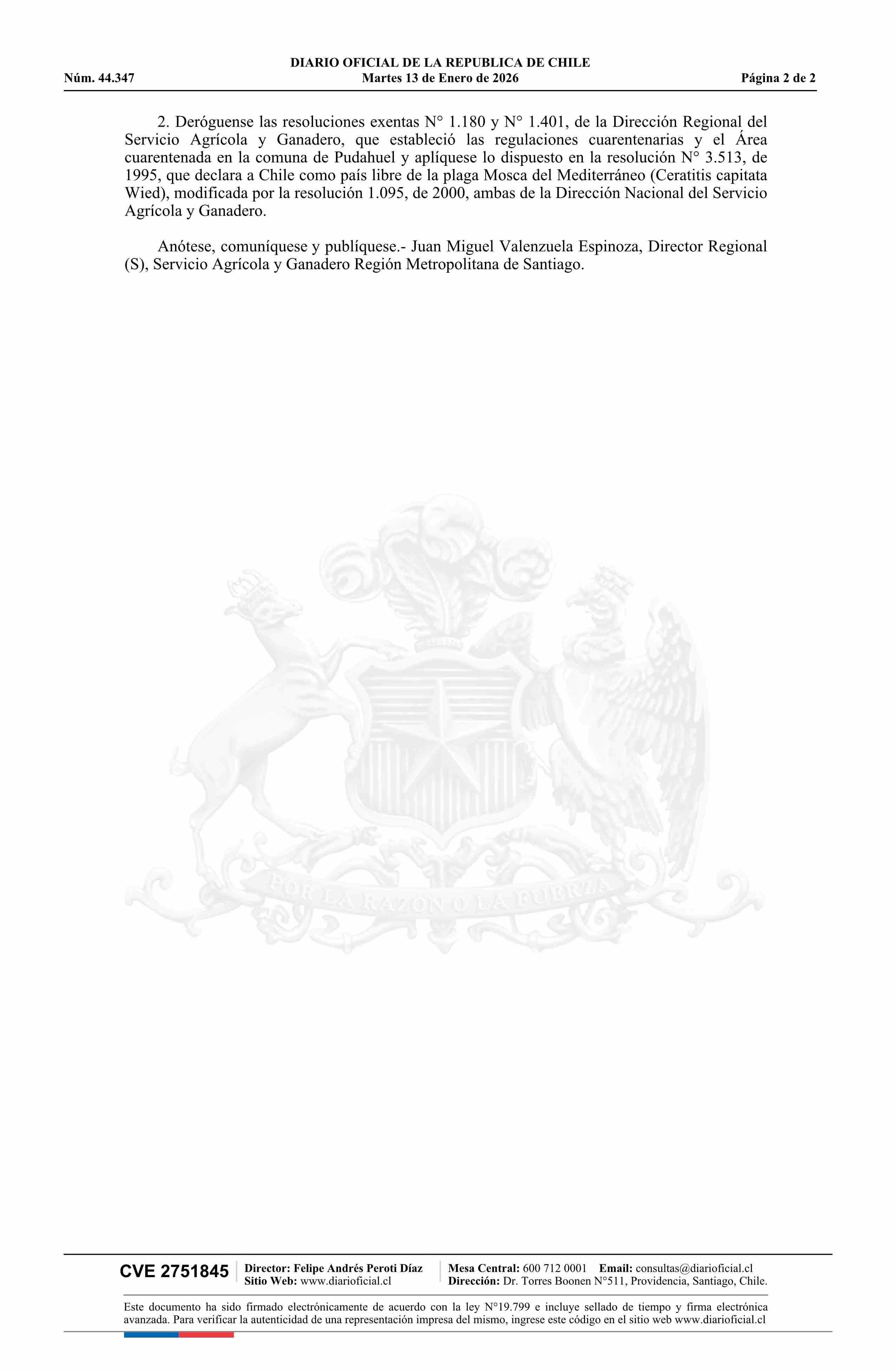 Resolución exenta número 5.112, de 2025.- Declara libre de Mosca del Mediterráneo (Ceratitis capitata W.) el área cuarentenada para el Mercado de China 13-01-2026 Diario Oficial Edición Electrónica |