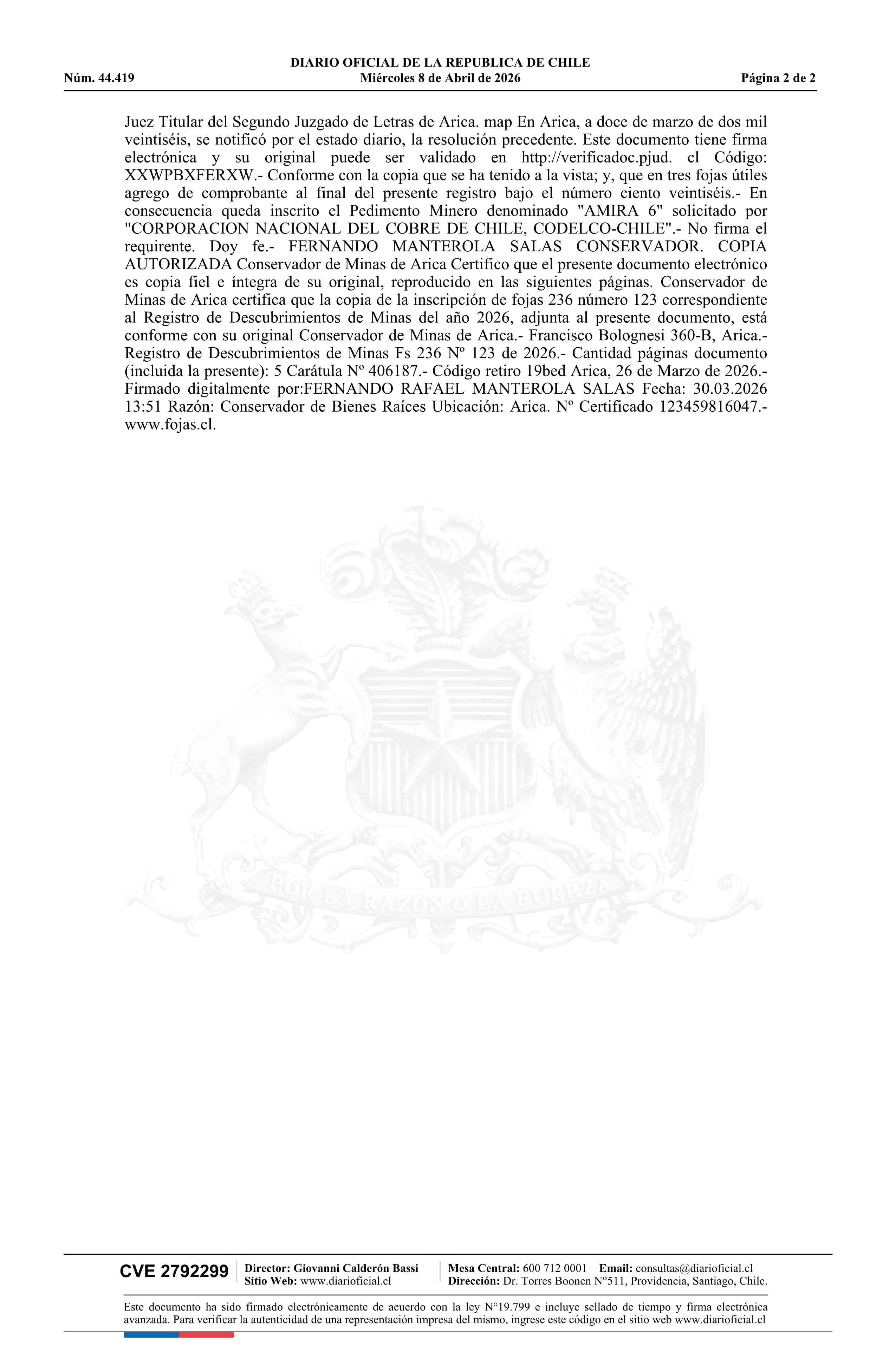 AMIRA 6 / Corporación Nacional del Cobre de Chile 08-04-2026 DIARIO OFICIAL CHILE - BOLETÍN OFICIAL DE MINERÍA |