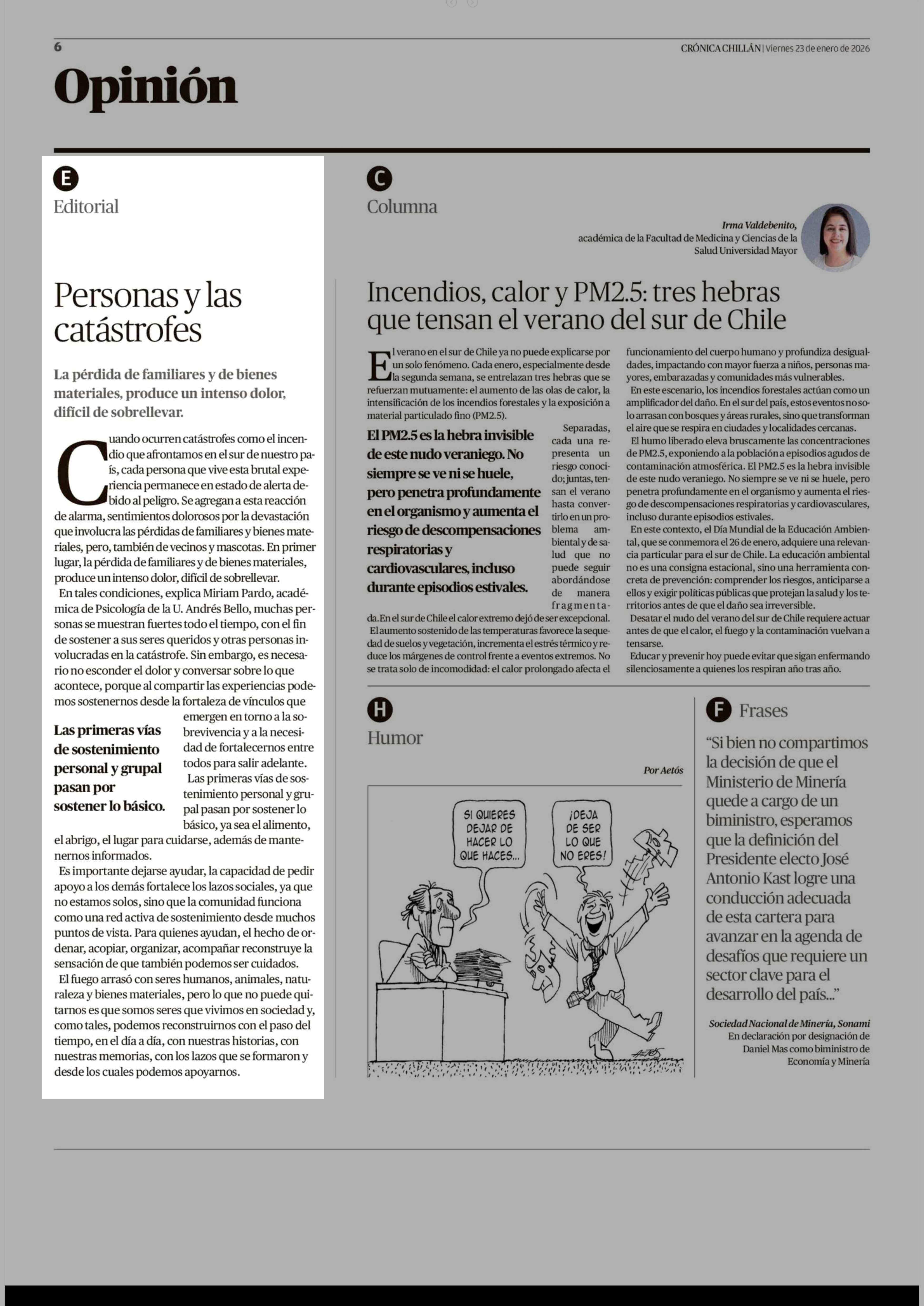 Editorial: Personas y las catástrofes 23-01-2026 Crónica de Chillán |