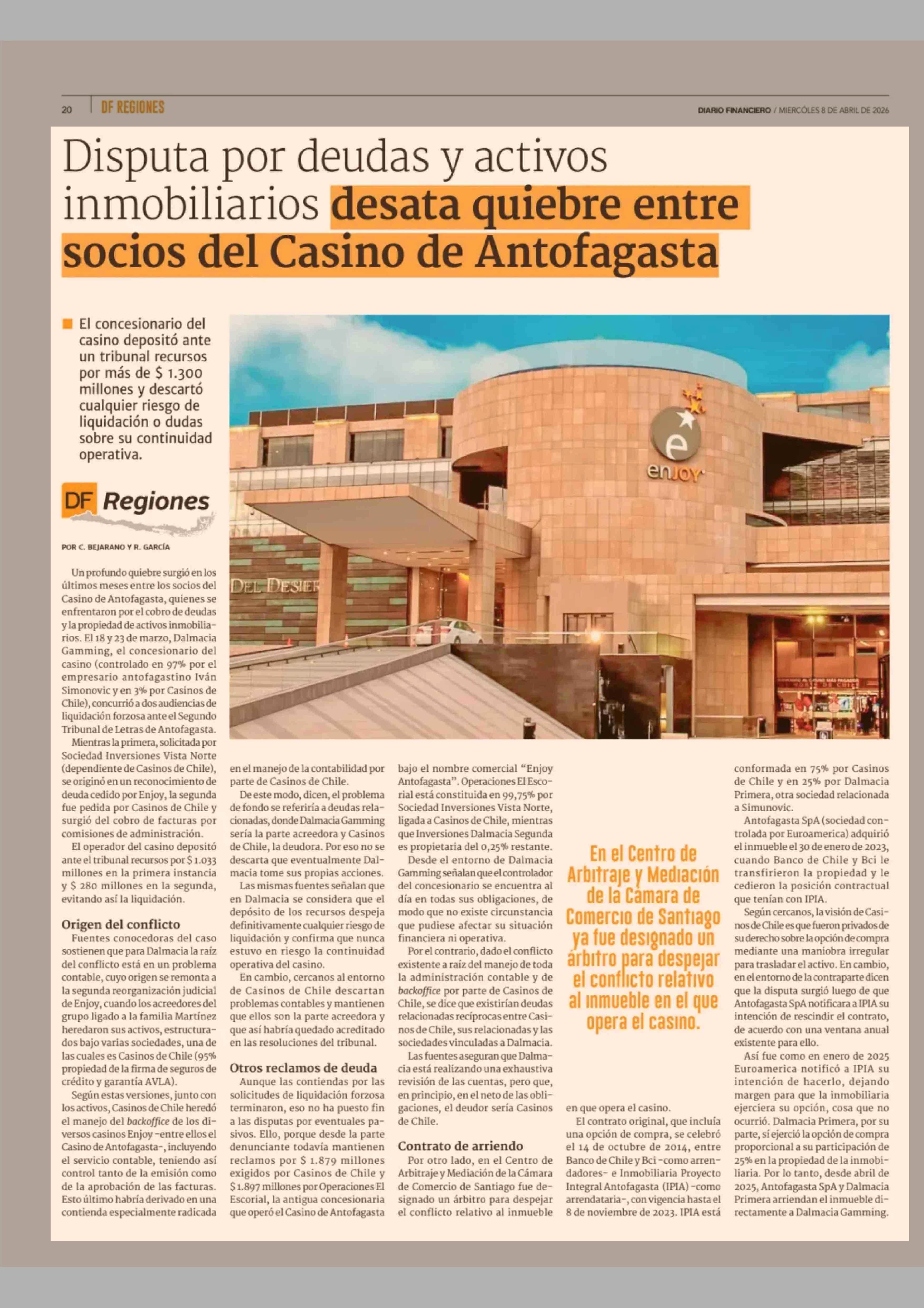 Disputa por deudas y activos inmobiliarios desata quiebre entre socios del Casino de Antofagasta 08-04-2026 Diario Financiero |
