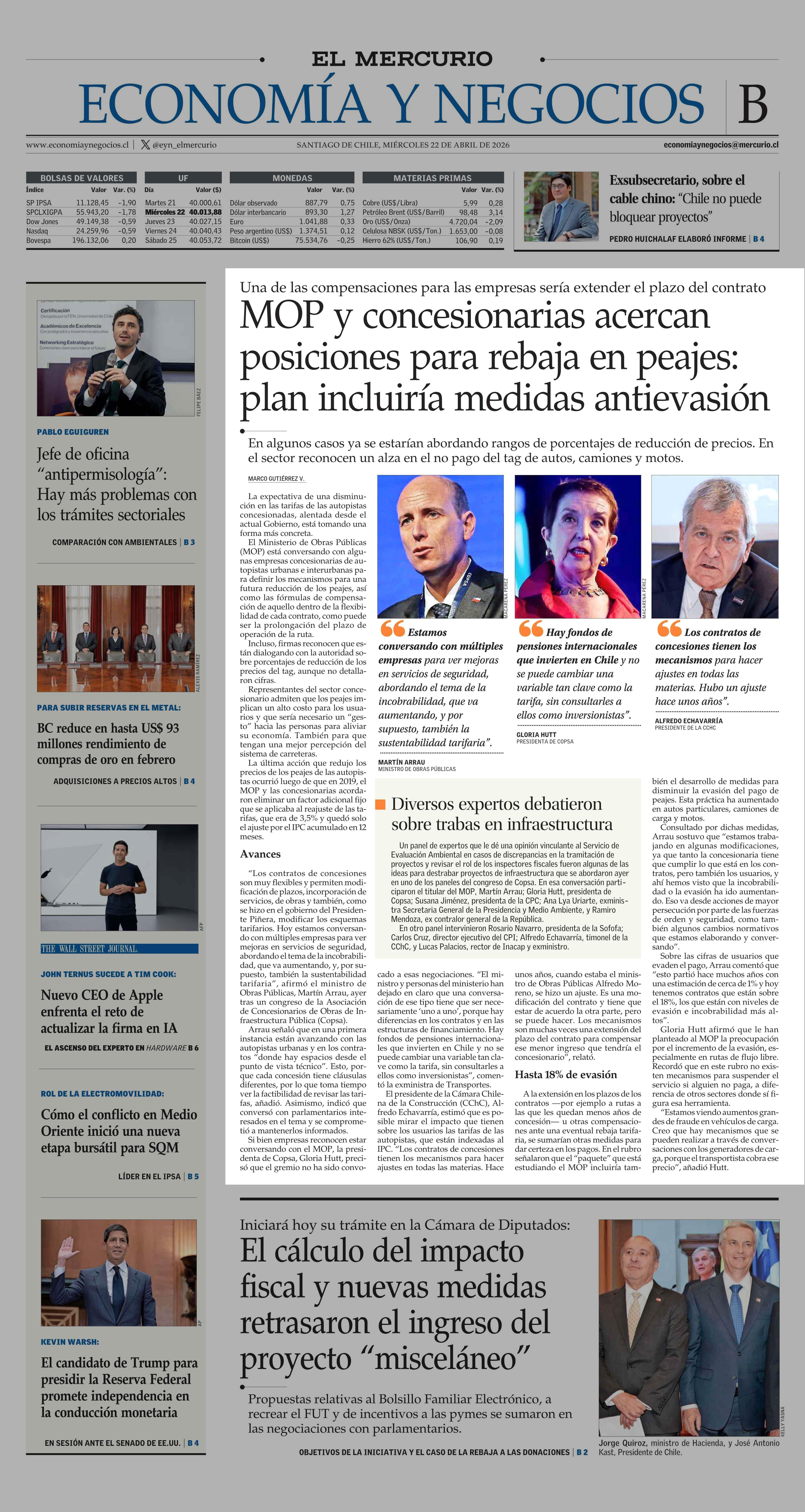 MOP y concesionarias acercan posiciones para rebaja en peajes: plan incluiría medidas antievasión 22-04-2026 El Mercurio |