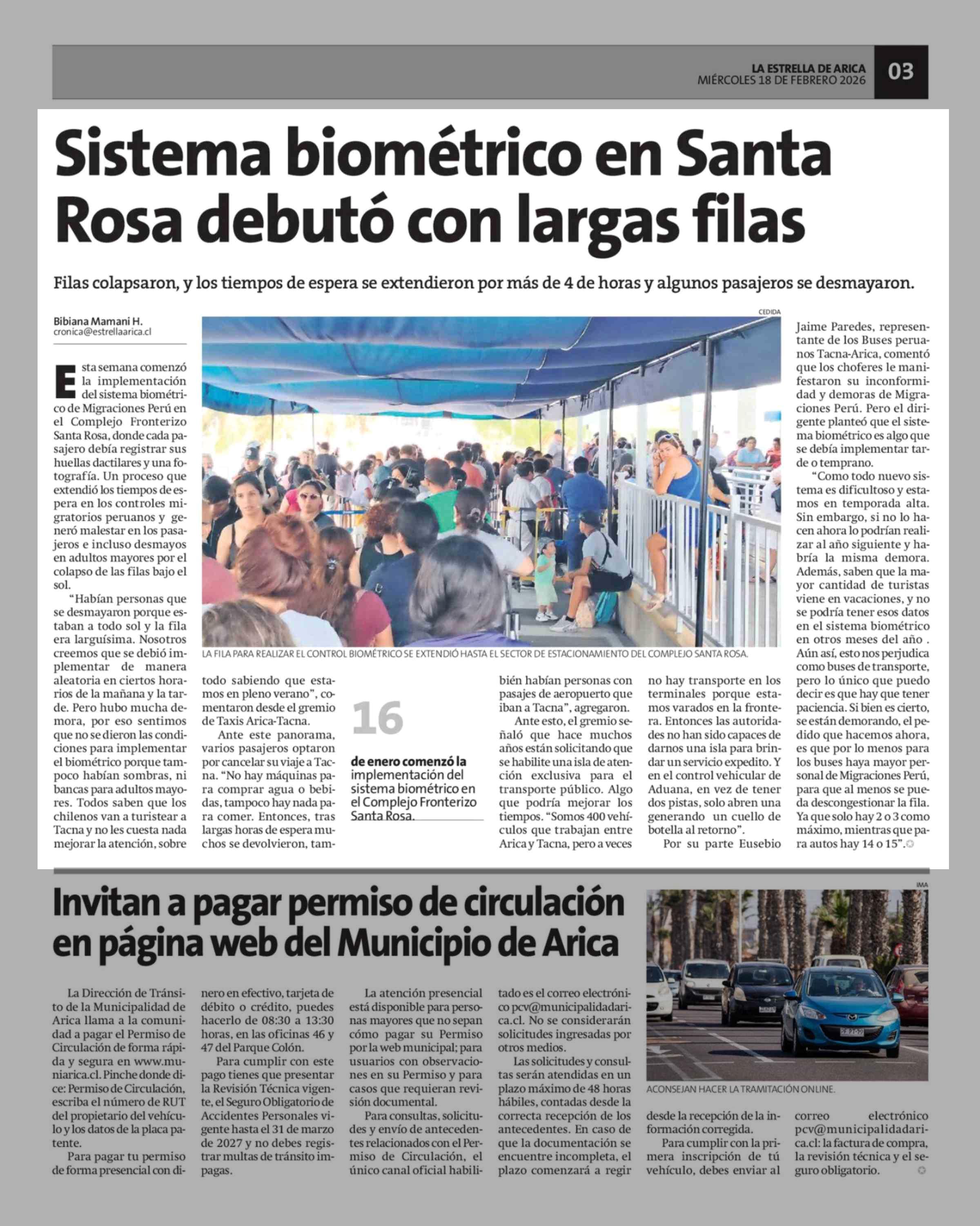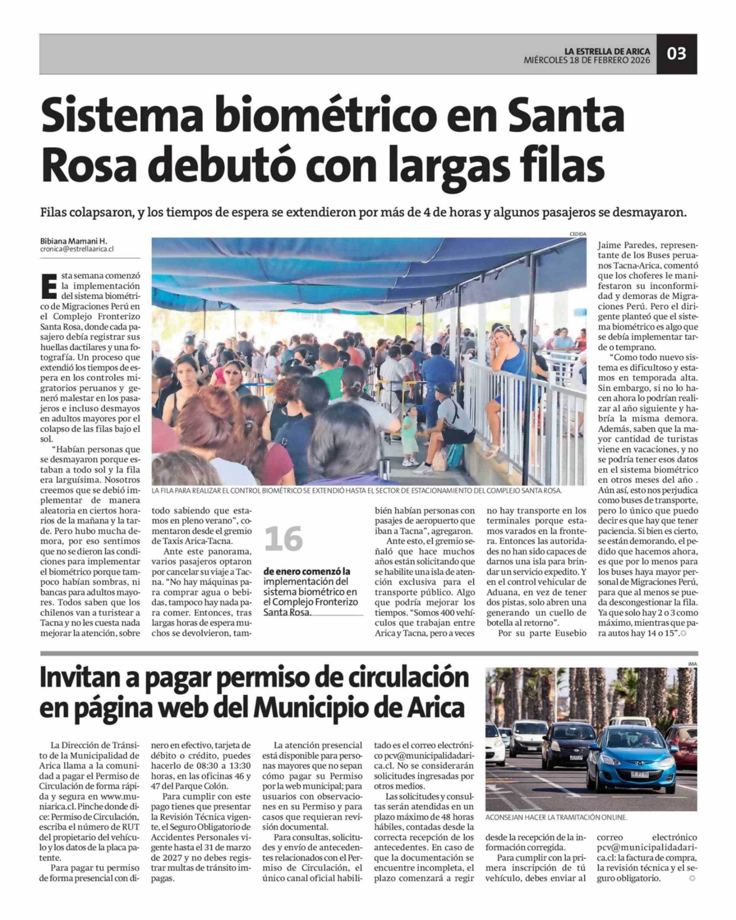 Sistema biométrico en Santa Rosa debutó con largas filas 18-02-2026 La Estrella de Arica |