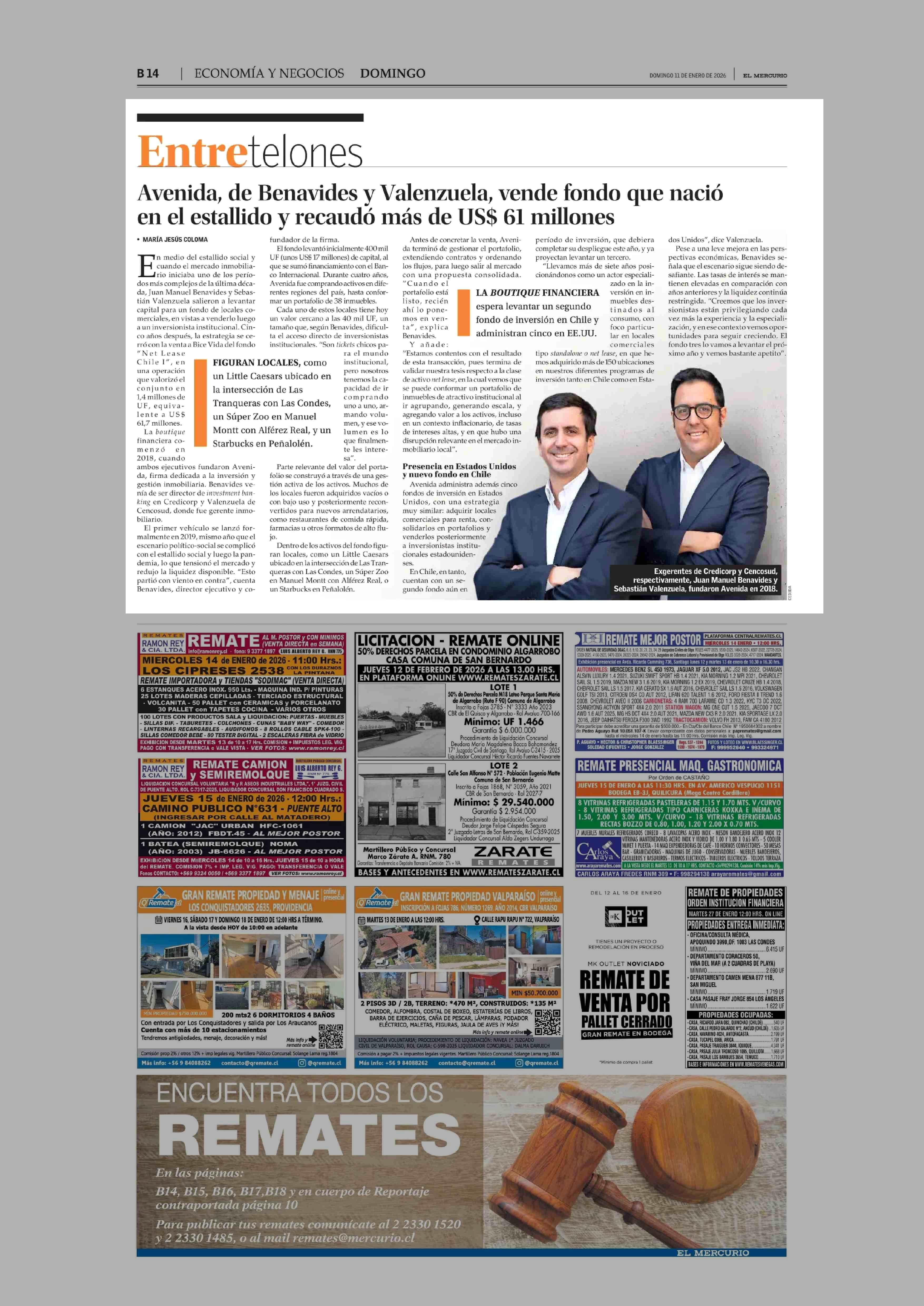 Avenida, de Benavides y Valenzuela, vende fondo que nació en el estallido y recaudó más de USS 61 millones 11-01-2026 El Mercurio |