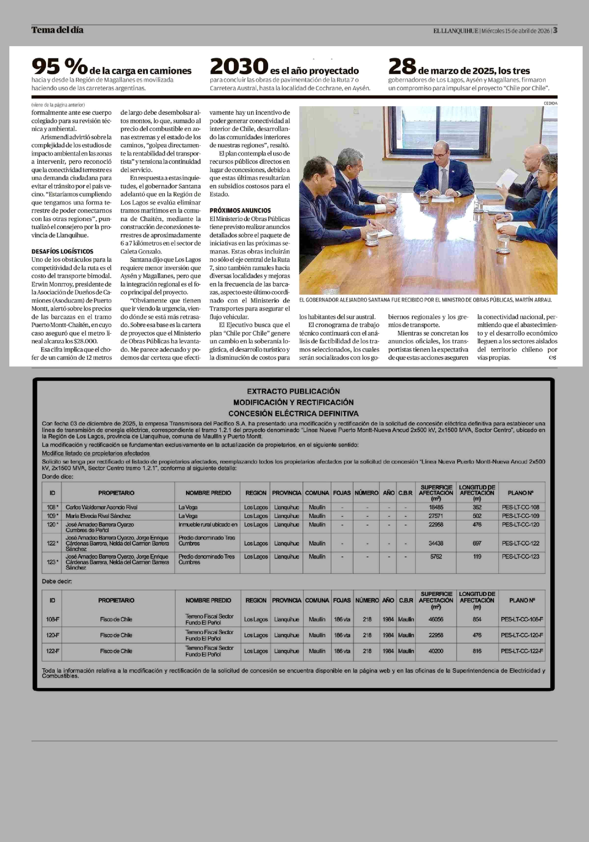 Gobernadores alistan cumbre para potenciar la conectividad bimodal 15-04-2026 El Llanquihue |