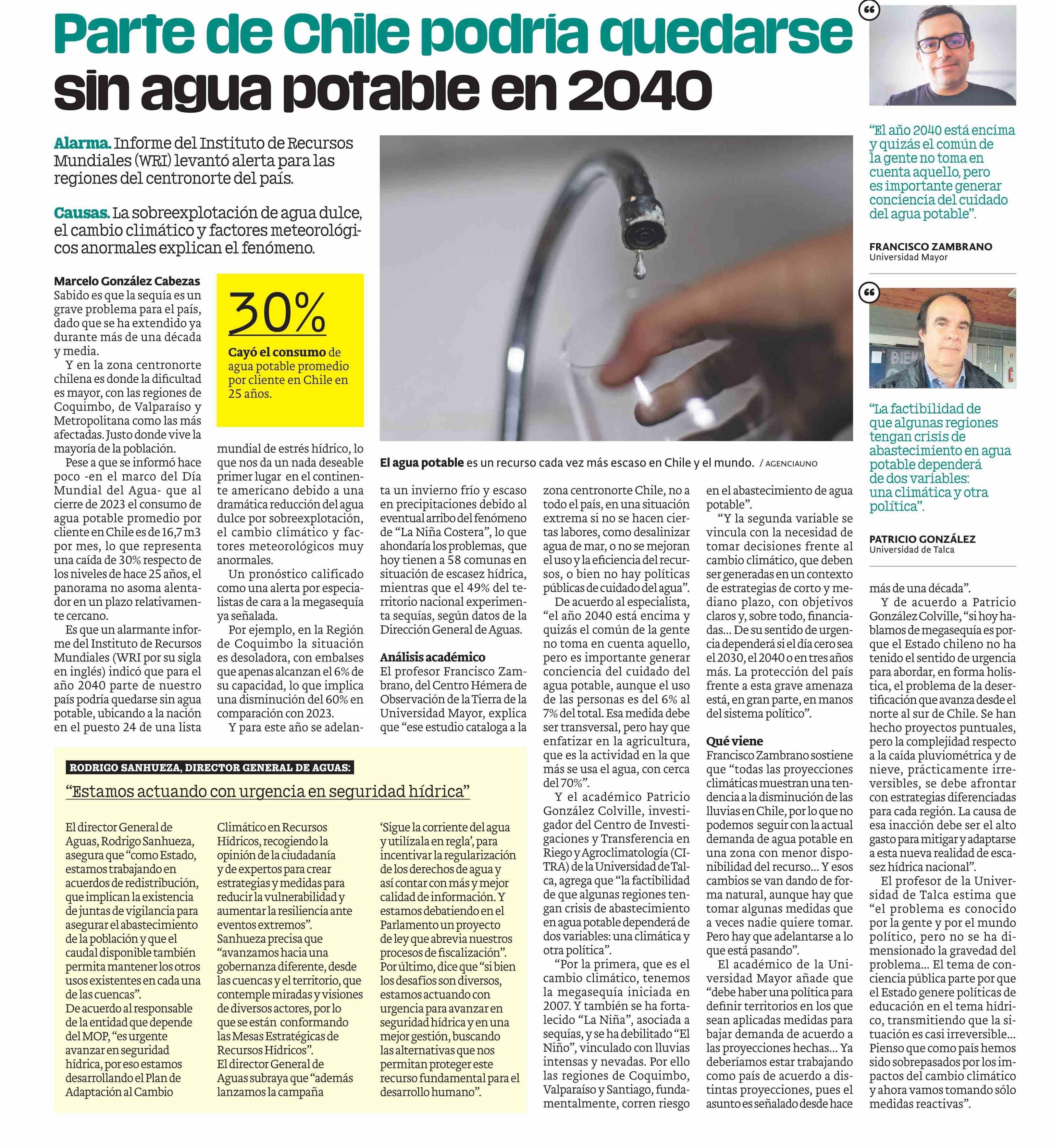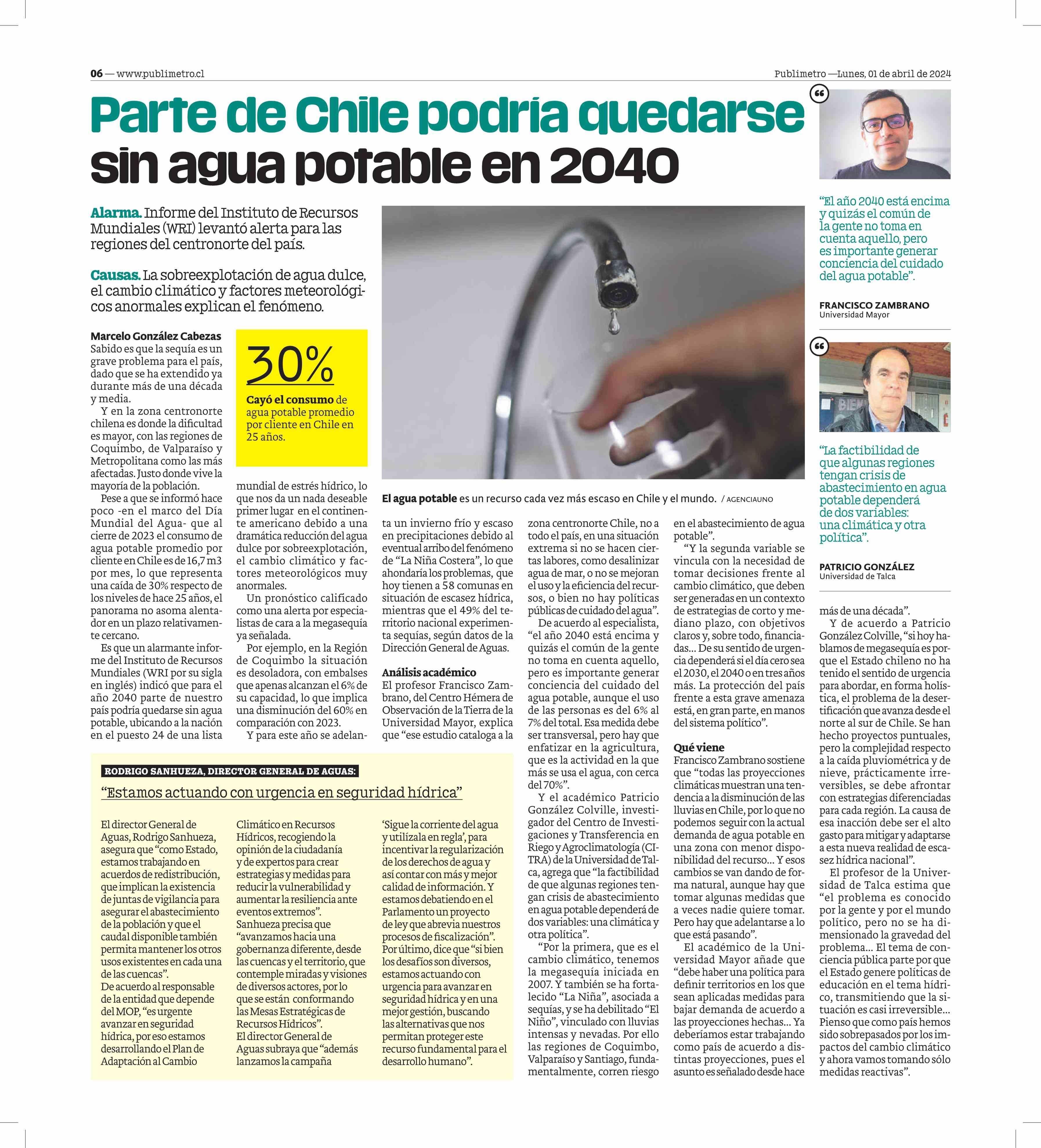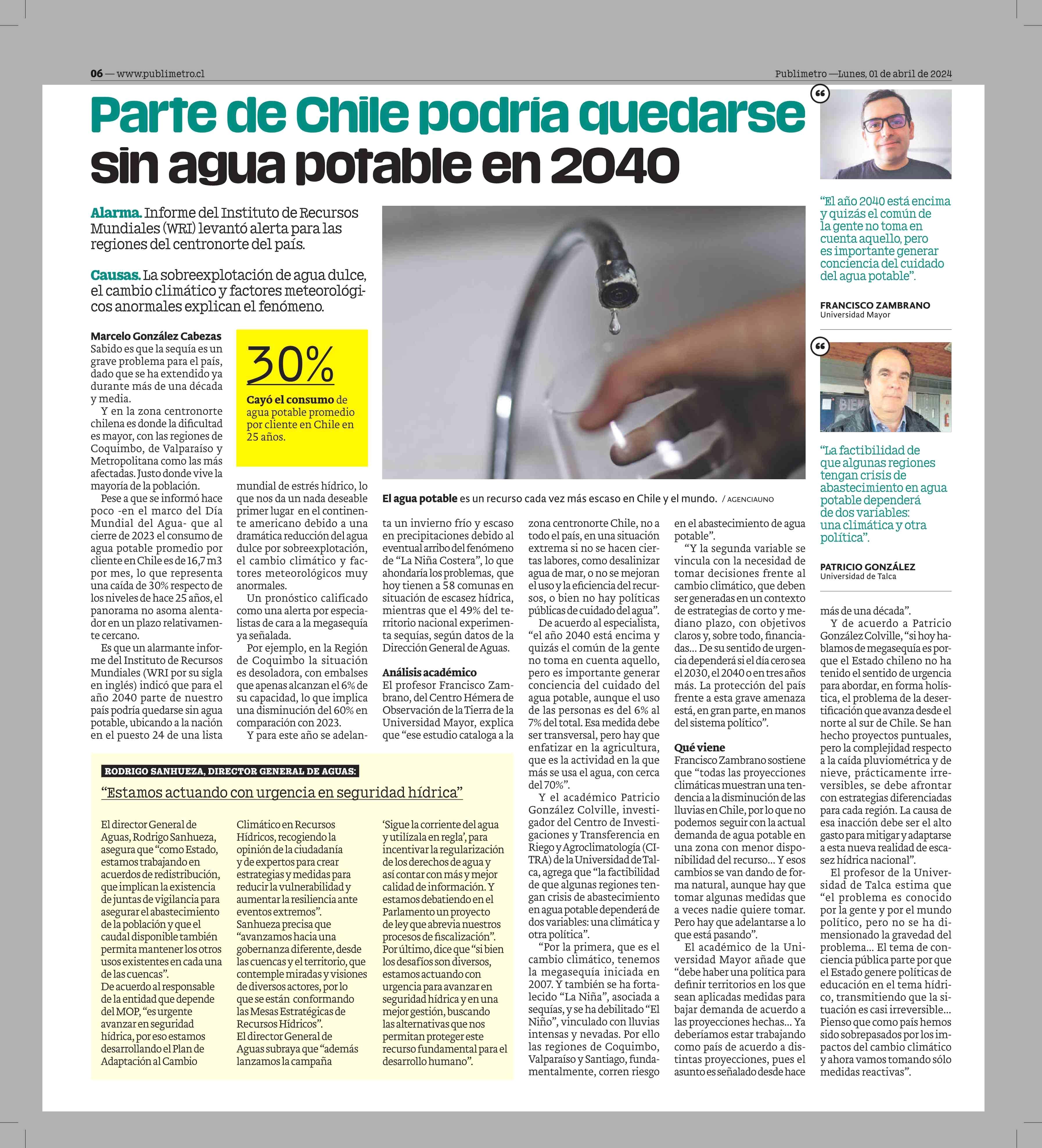 Parte de Chile podría quedarse sin agua potable en 2040 01-04-2024 Publimetro |