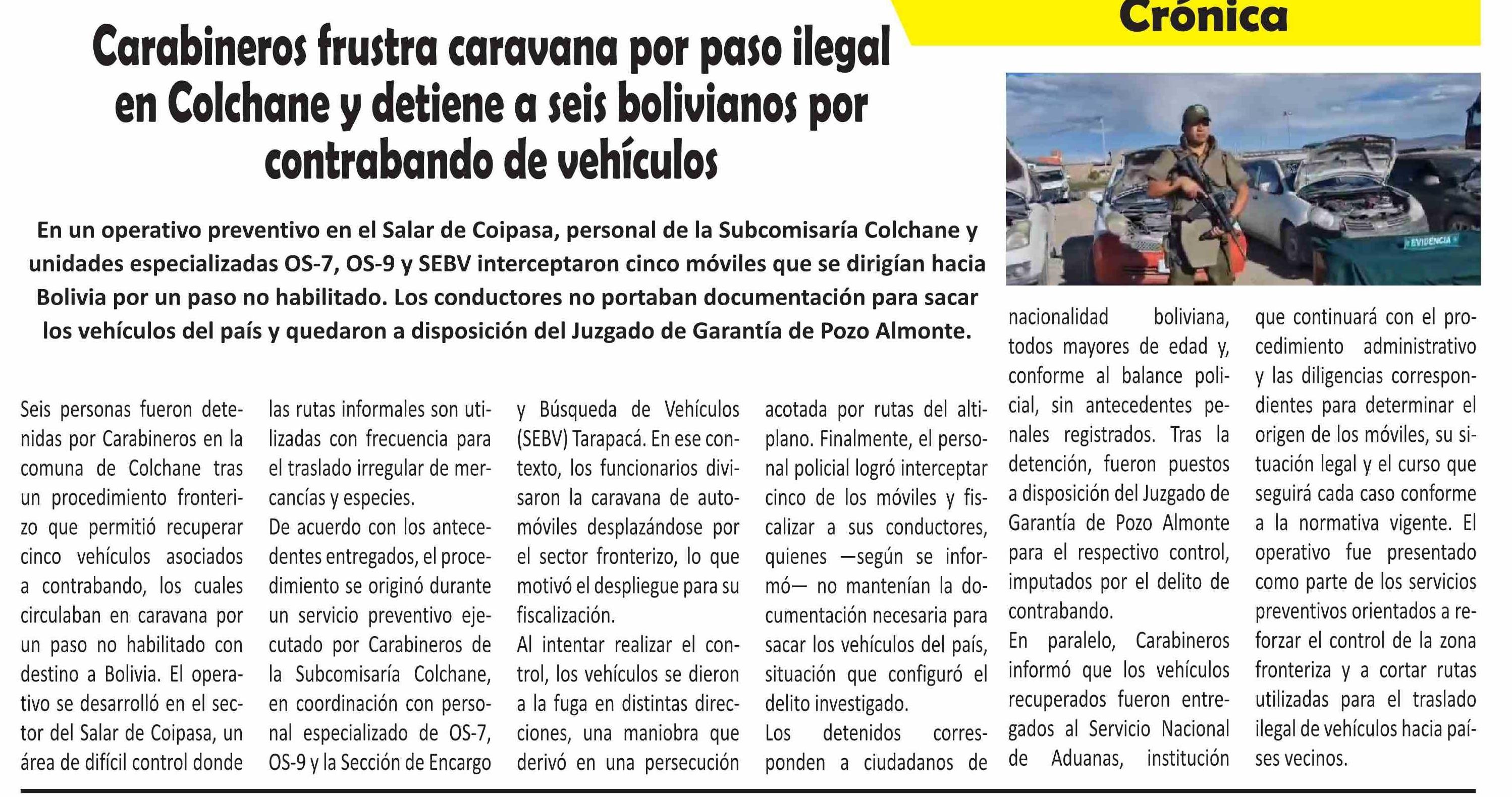 Título: Carabineros frustra caravana por paso ilegal en Colchane y detiene a seis bolivianos por contrabando de vehículos