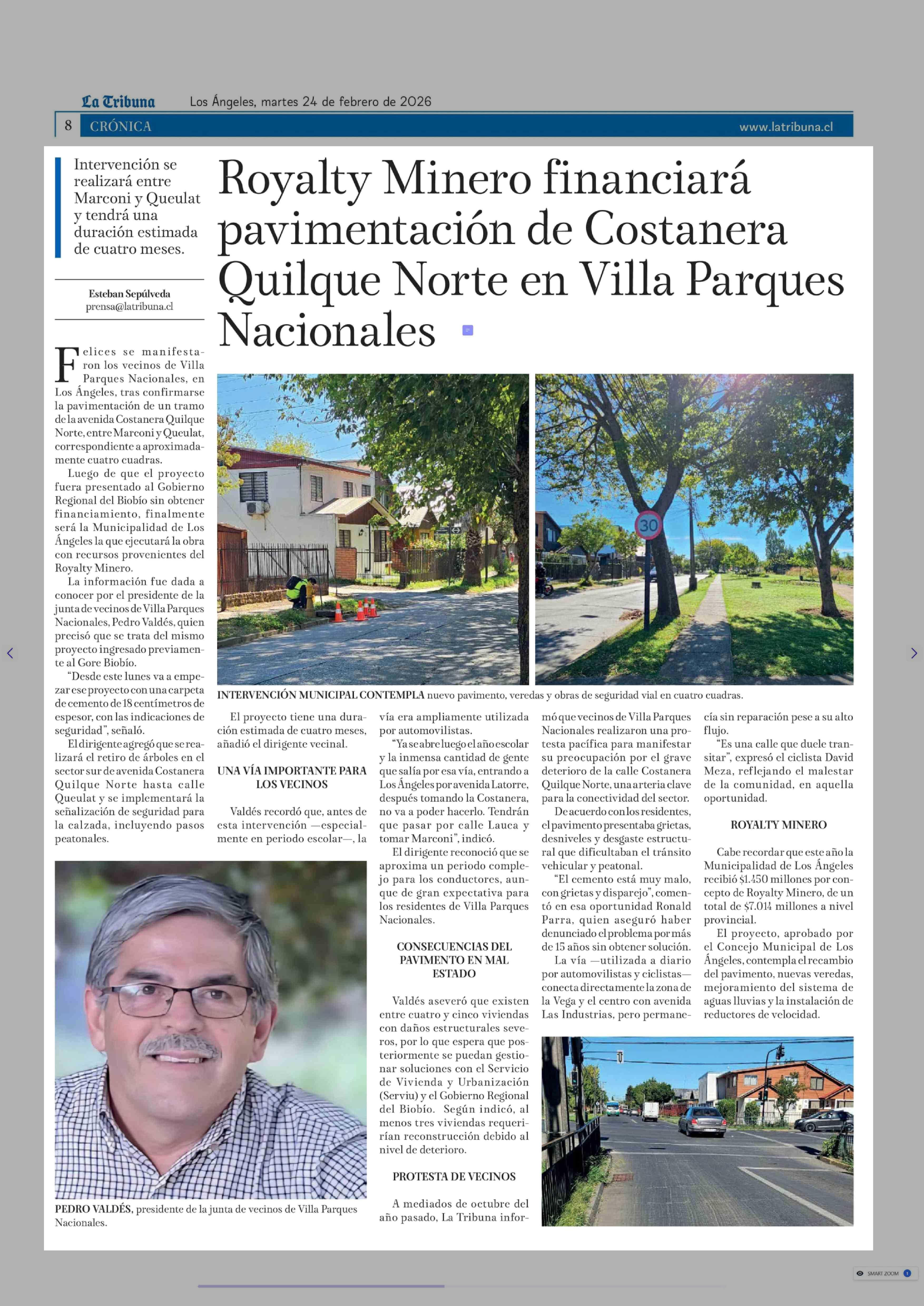 Royalty Minero financiará pavimentación de Costanera Quilque Norte en Villa Parques Nacionales 24-02-2026 La Tribuna |