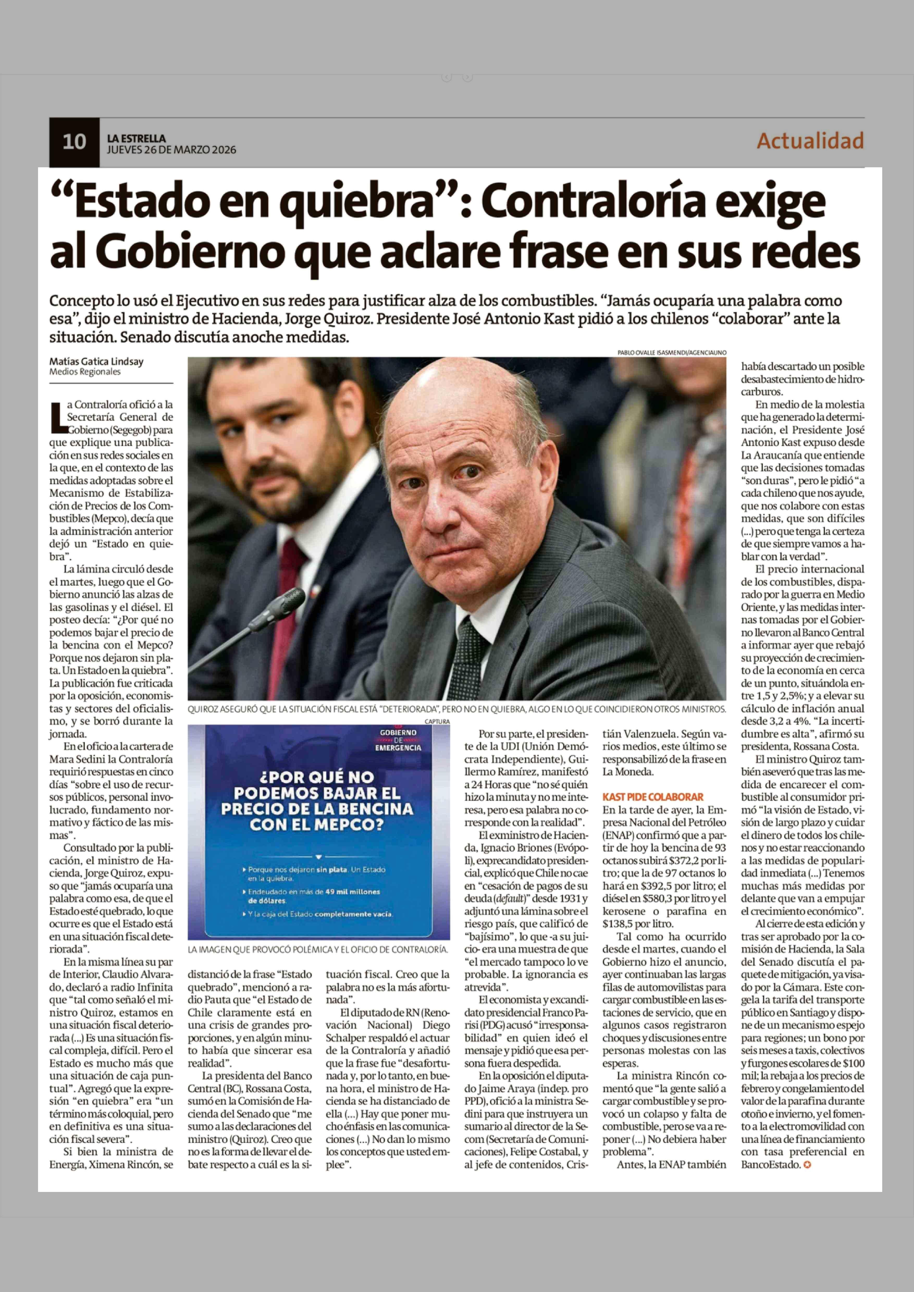 "Estado en quiebra": Contraloría exige al Gobierno que aclare frase en sus redes 26-03-2026 La Estrella de Chiloé |