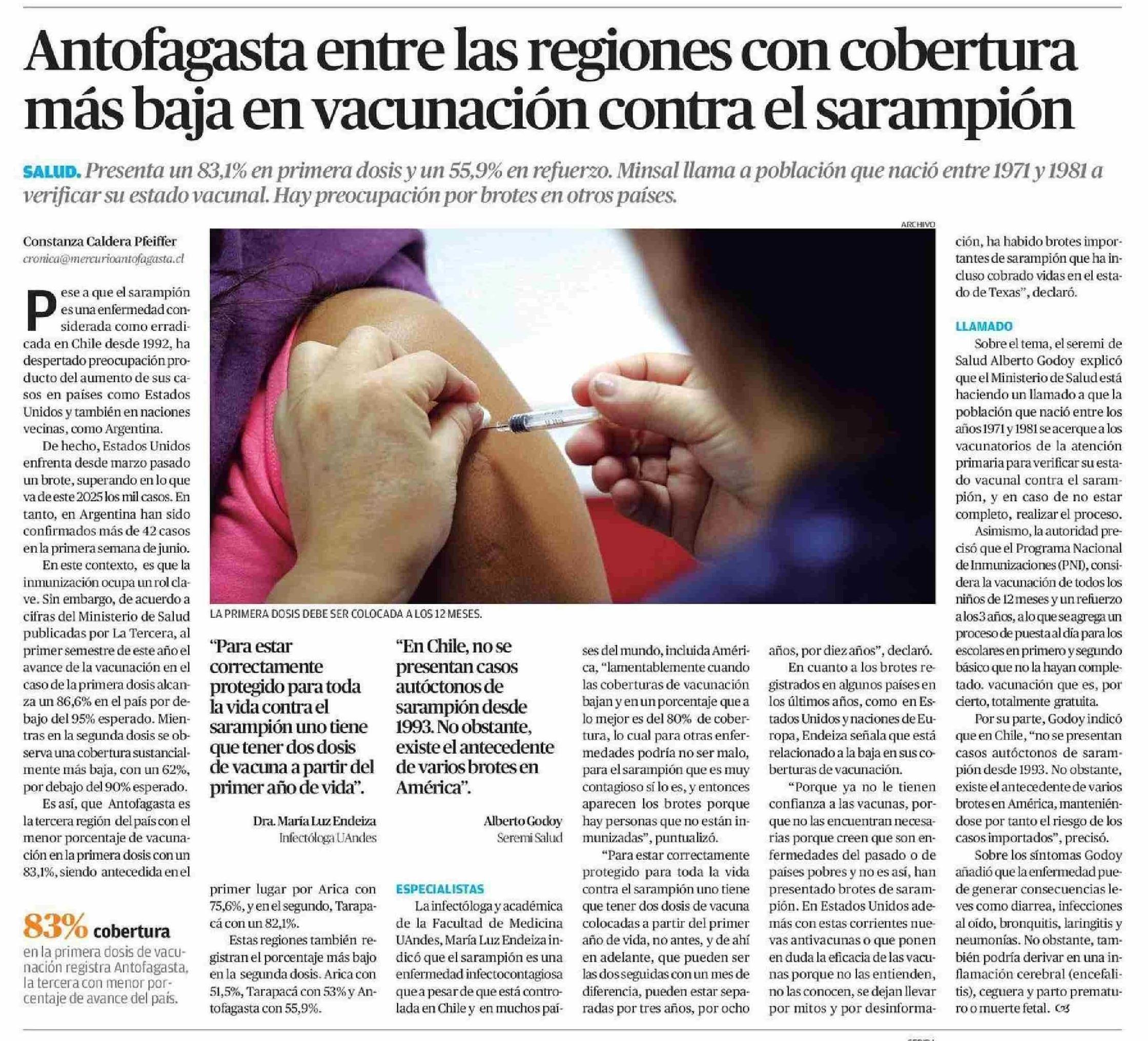 Antofagasta entre las regiones con cobertura más baja en vacunación contra el sarampión 20-06-2025 El Mercurio de Antofagasta |