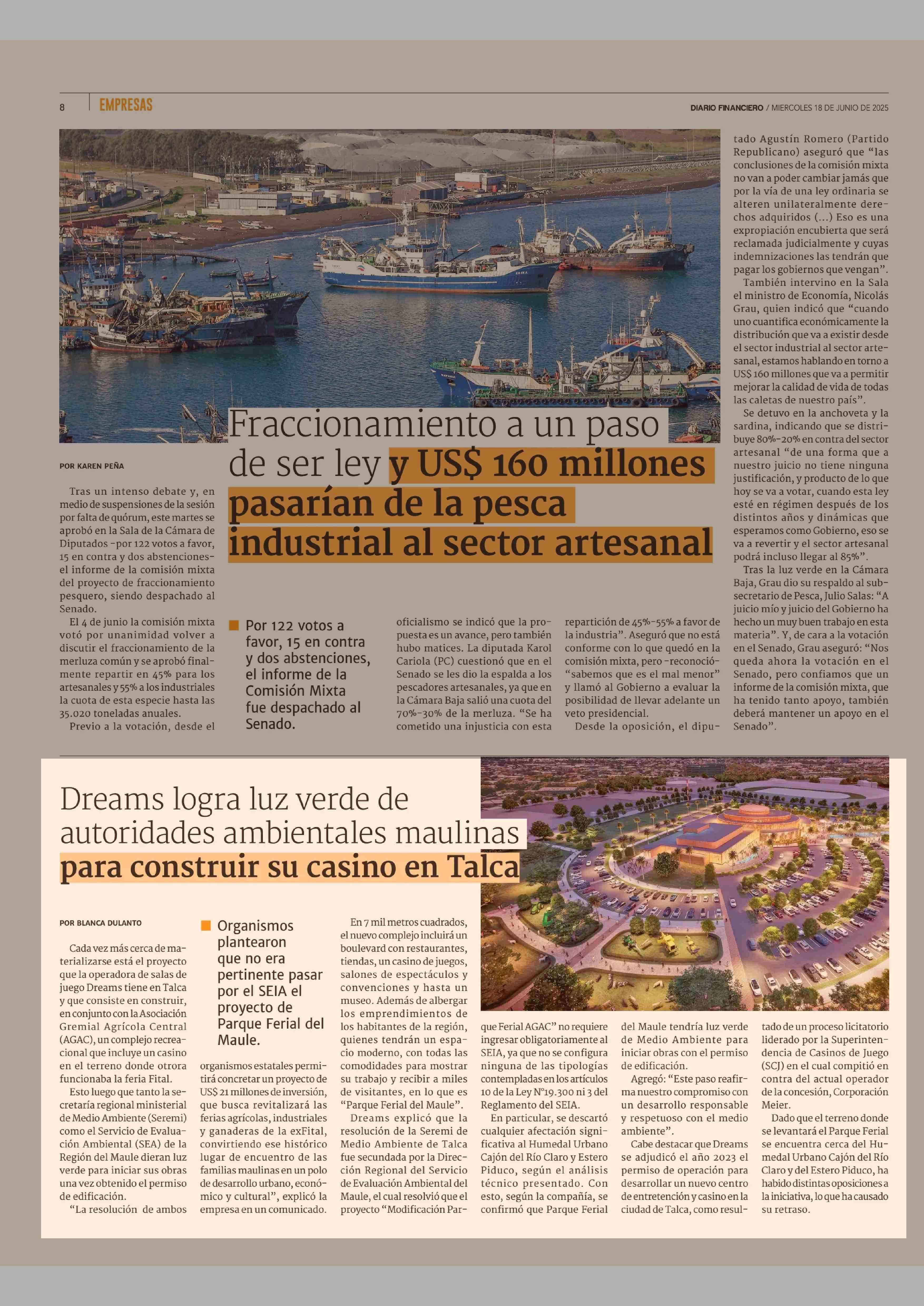 Dreams logra luz verde de autoridades ambientales maulinas para construir su casino en Talca 18-06-2025 Diario Financiero |