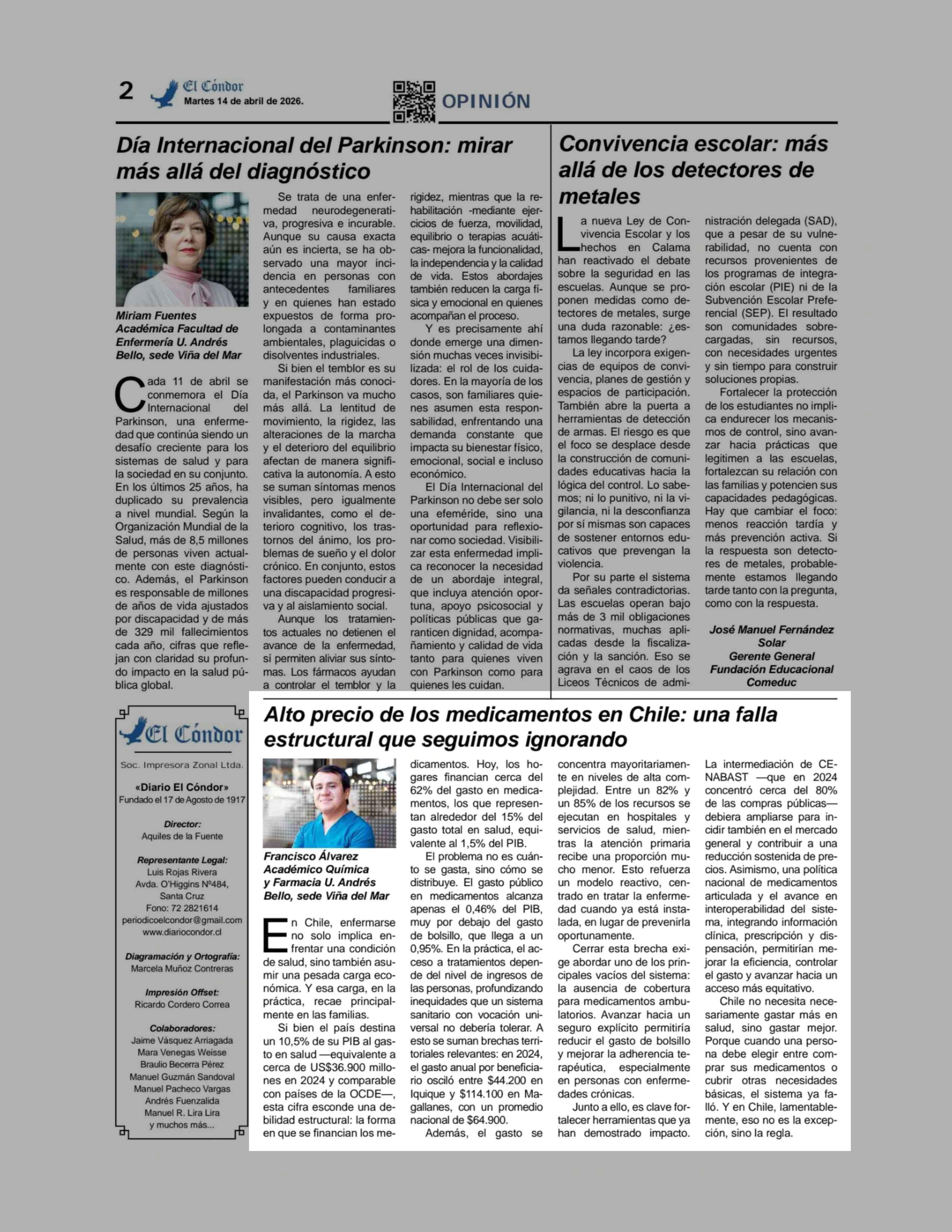 Columnas de Opinión: Alto precio de los medicamentos en Chile: una falla estructural que seguimos ignorando 14-04-2026 Diario El Cóndor |