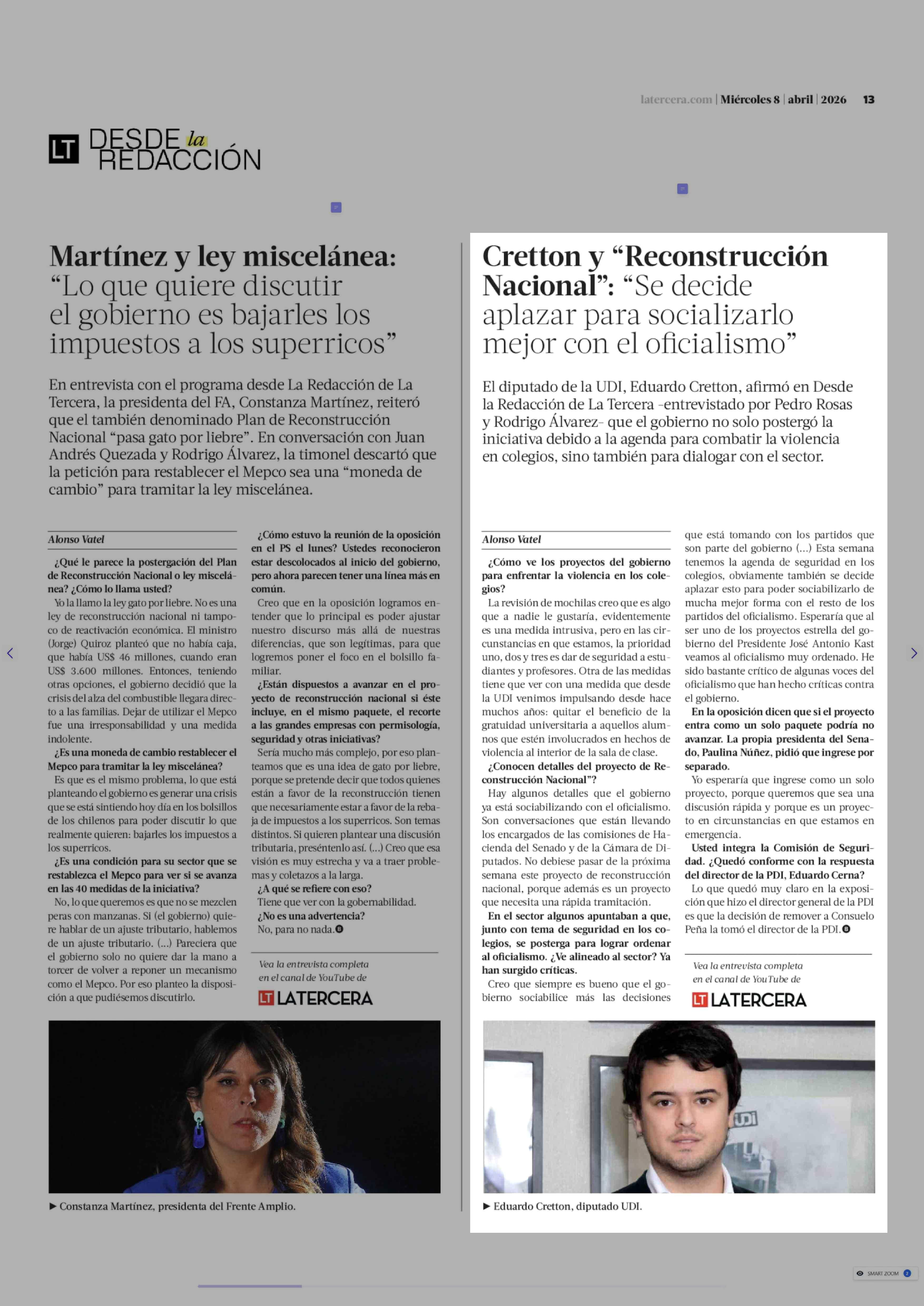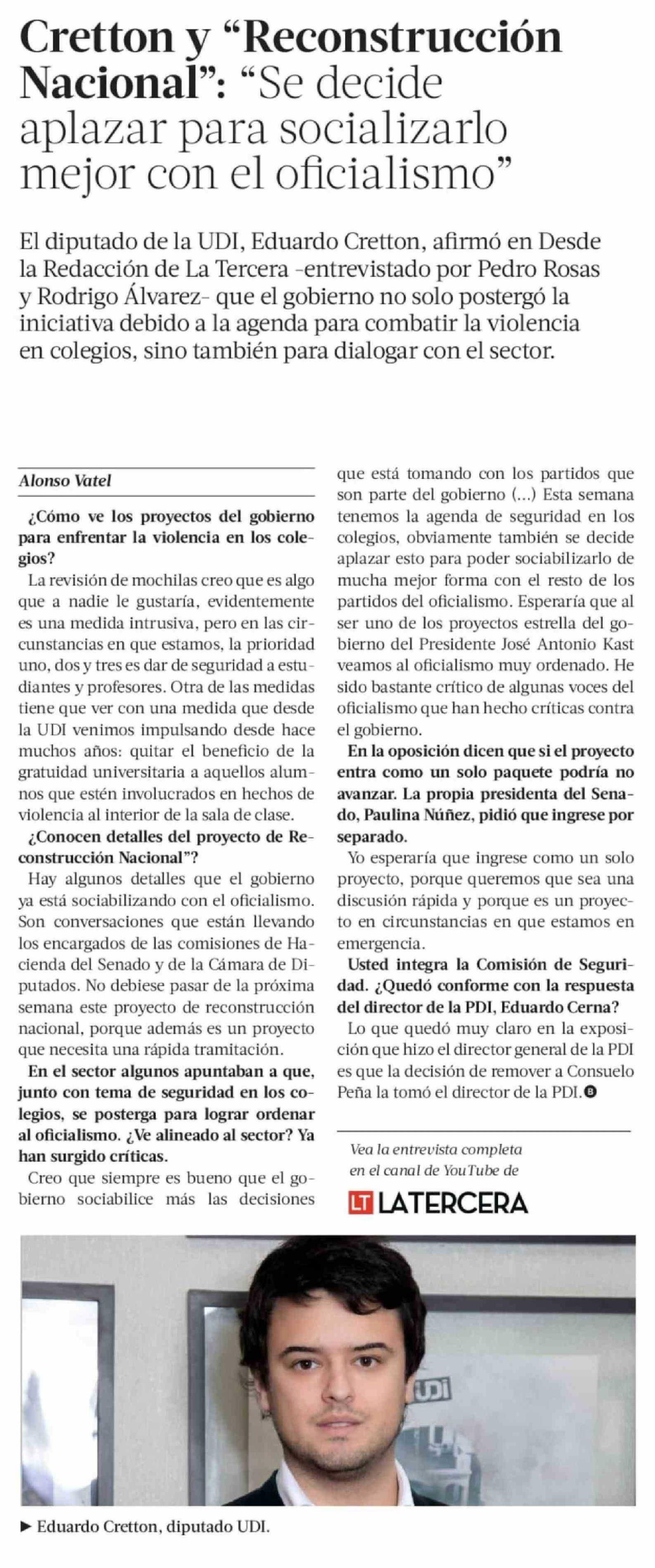 Cretton y "Reconstrucción Nacional": "Se decide aplazar para socializarlo mejor con el oficialismo" 08-04-2026 La Tercera |