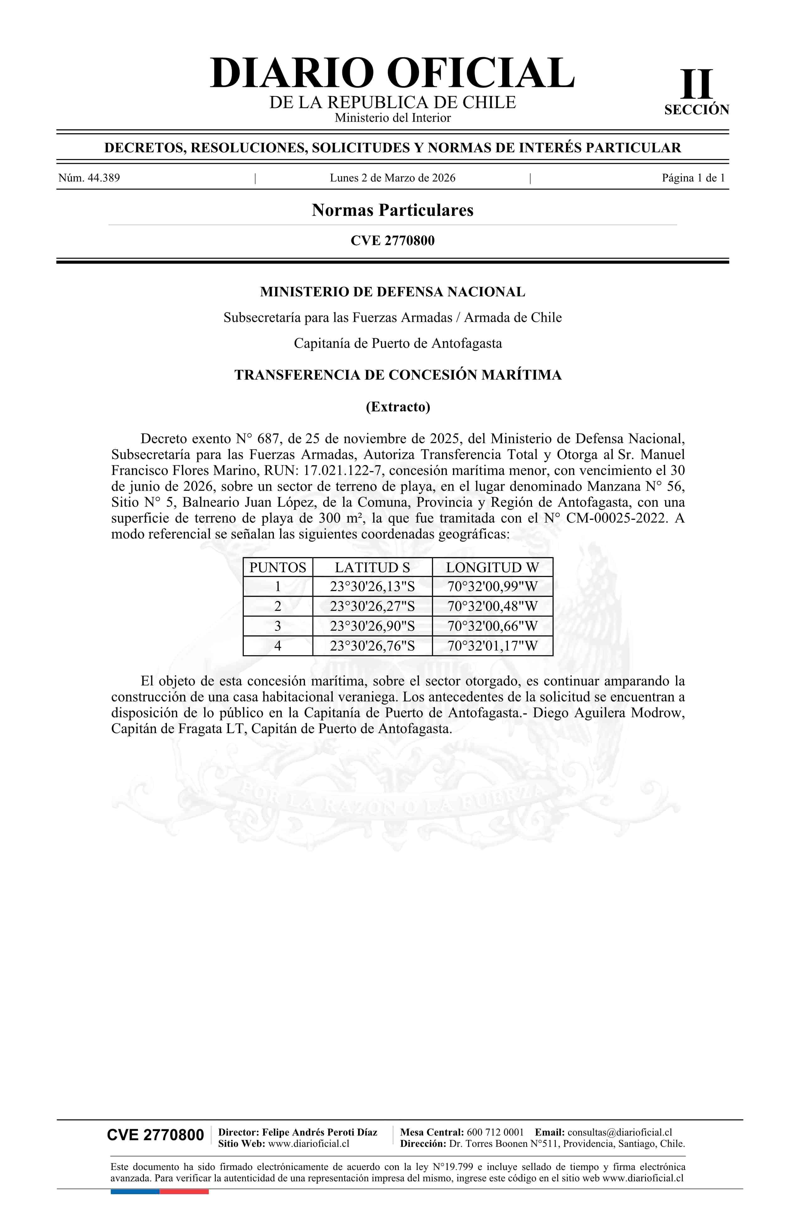 Extracto de decreto exento número 687, de 2025.- Transferencia de concesión marítima