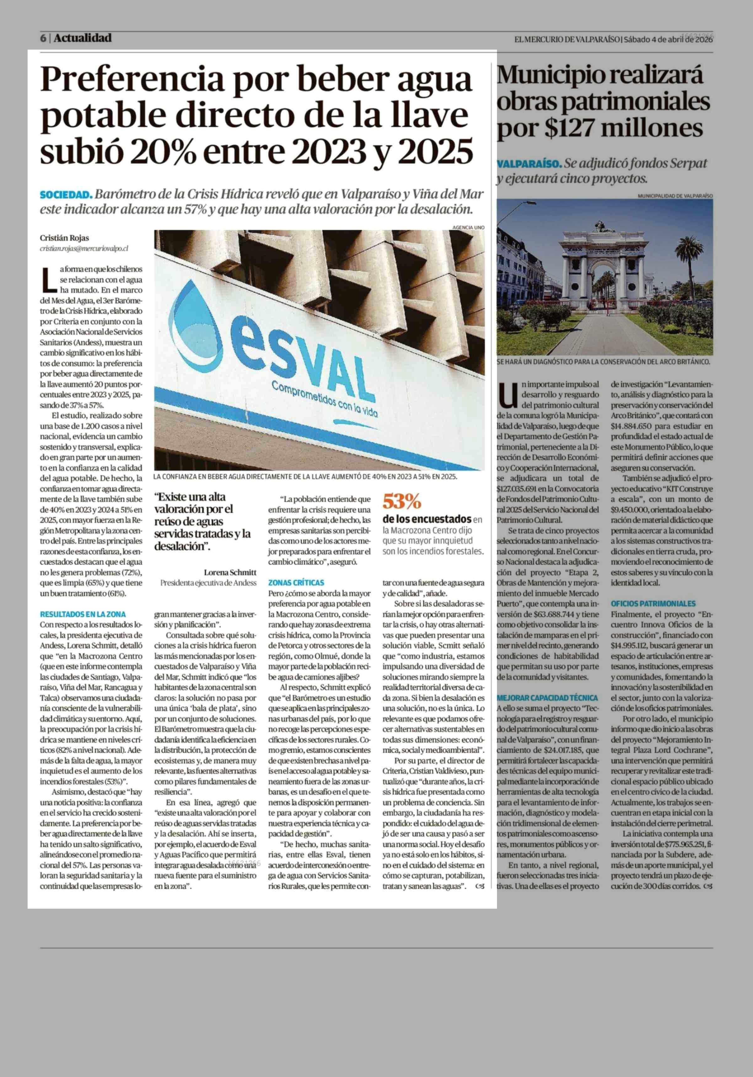 Preferencia por beber agua potable directo de la llave subió 20% entre 2023 y 2025 04-04-2026 El Mercurio de Valparaíso |