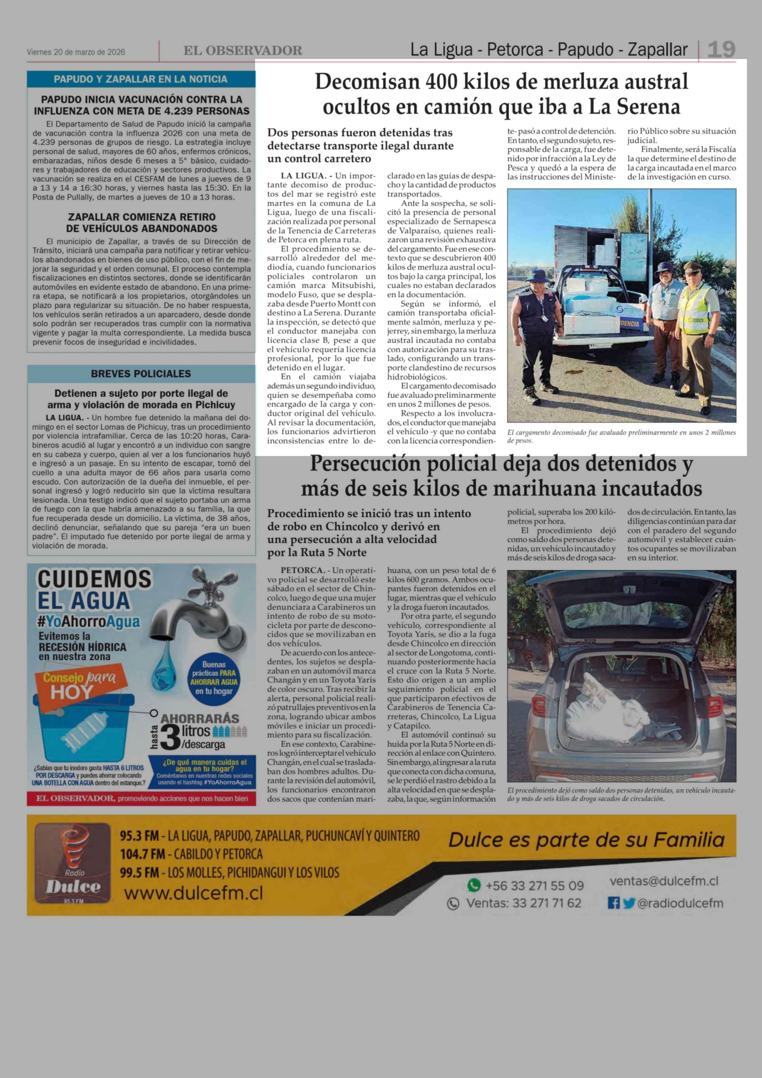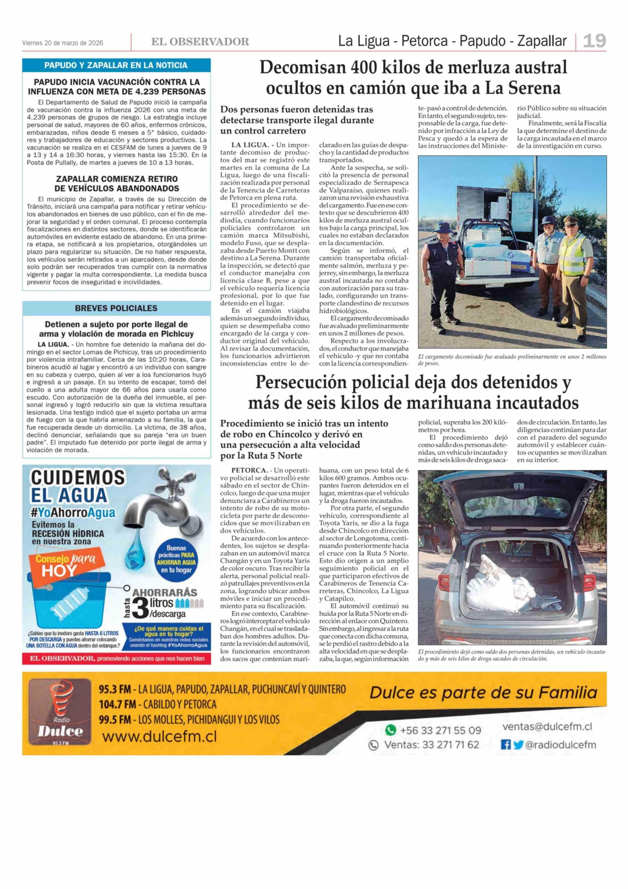 Decomisan 400 kilos de merluza austral ocultos en camión que iba a La Serena 20-03-2026 El Observador |