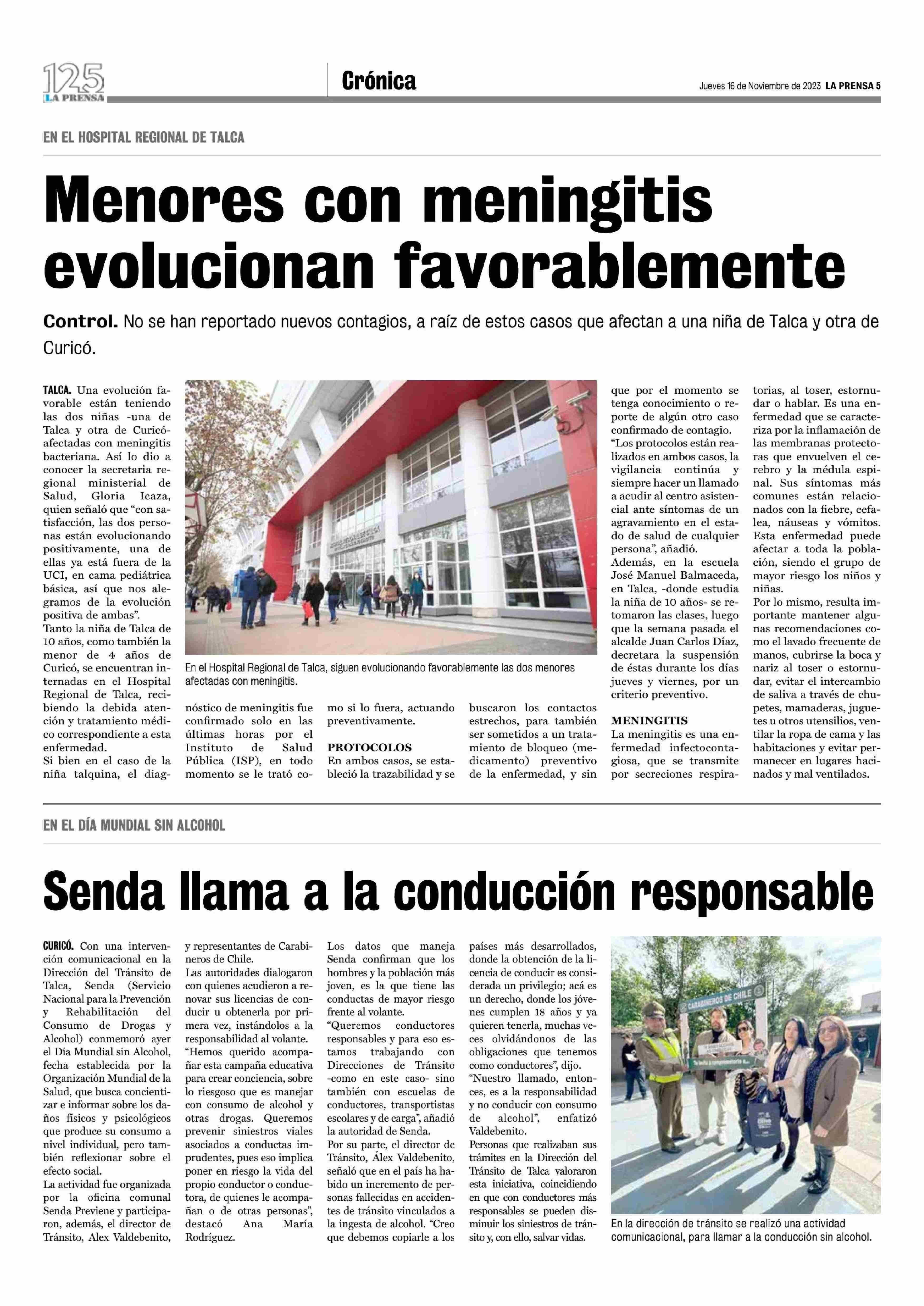 Menores con meningitis evolucionan favorablemente 16-11-2023 La Prensa de Curicó |